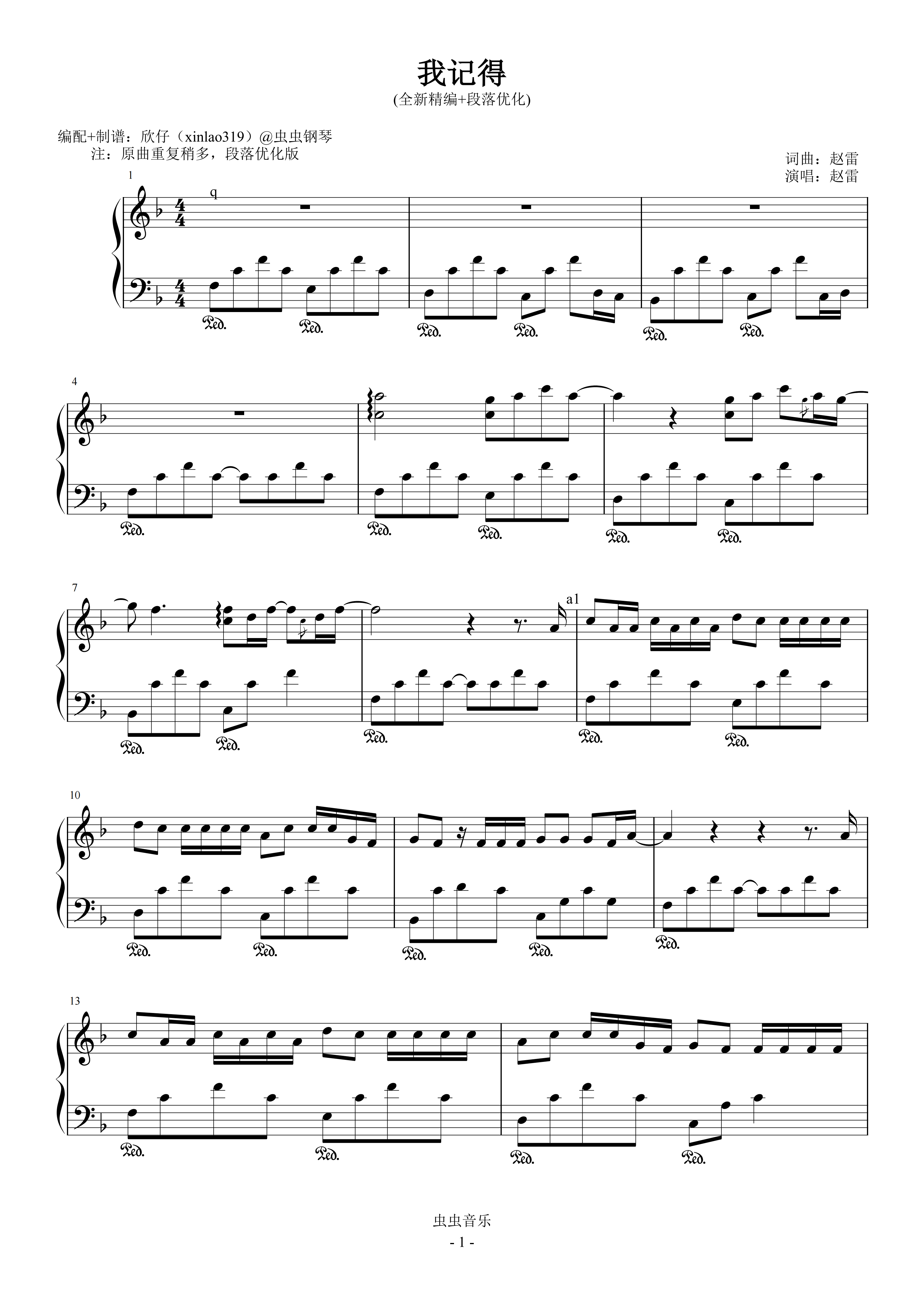钢琴谱:我记得(F、赵雷、精编+段落优化)