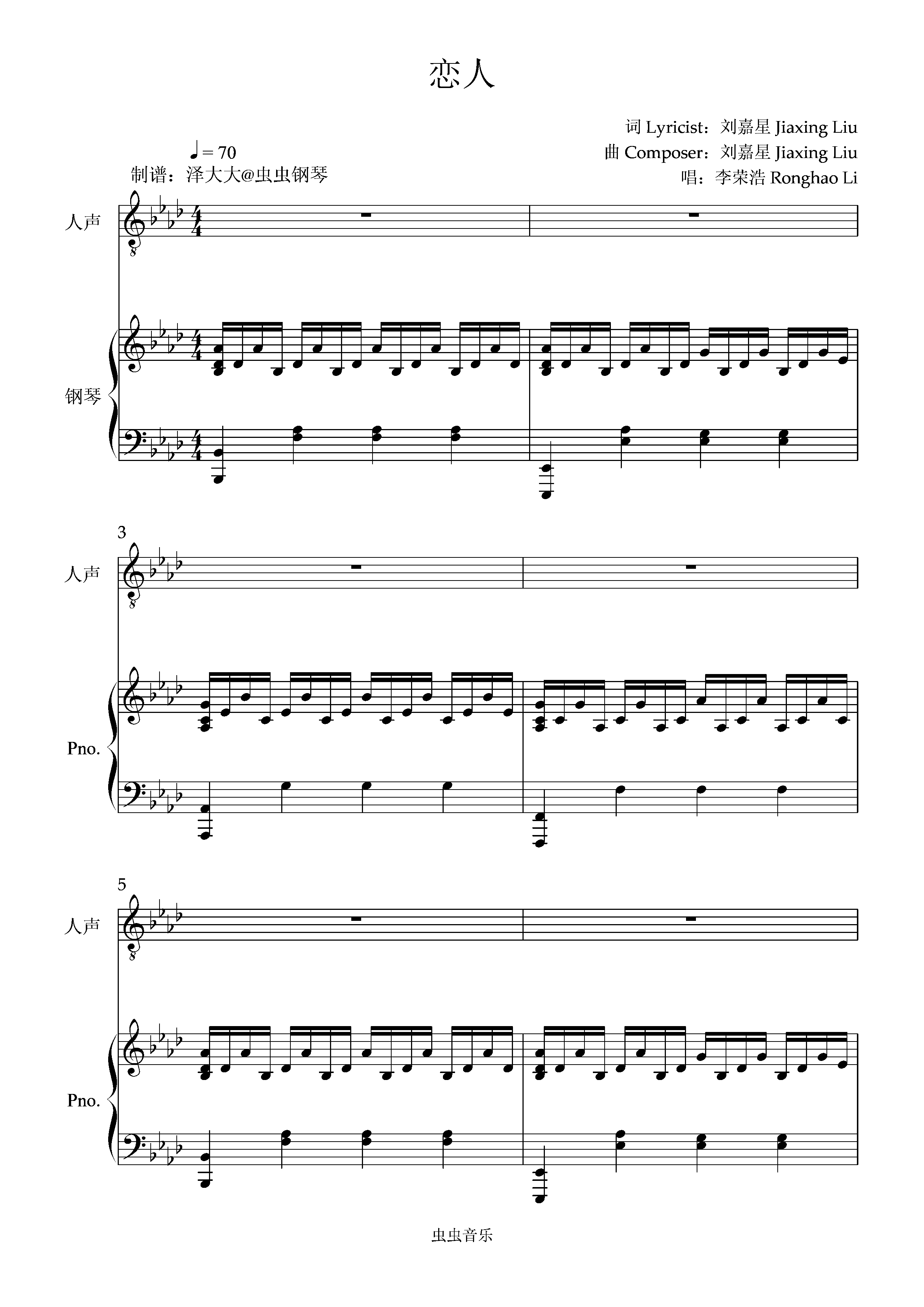 钢琴谱:恋人【原版弹唱附词】泽大大 李荣浩