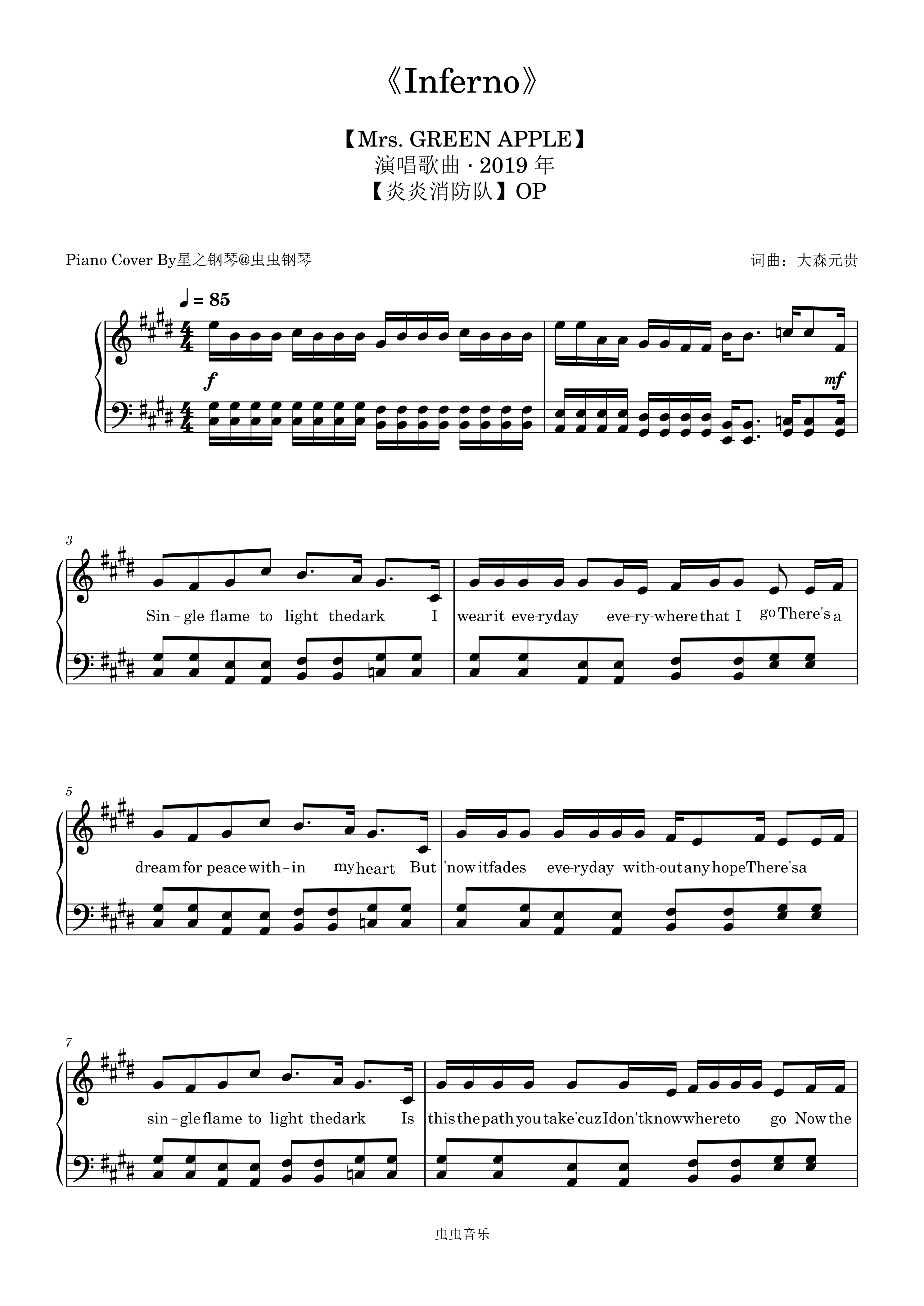 • インフェルノ钢琴简谱 E调 数字双手 大森元貴