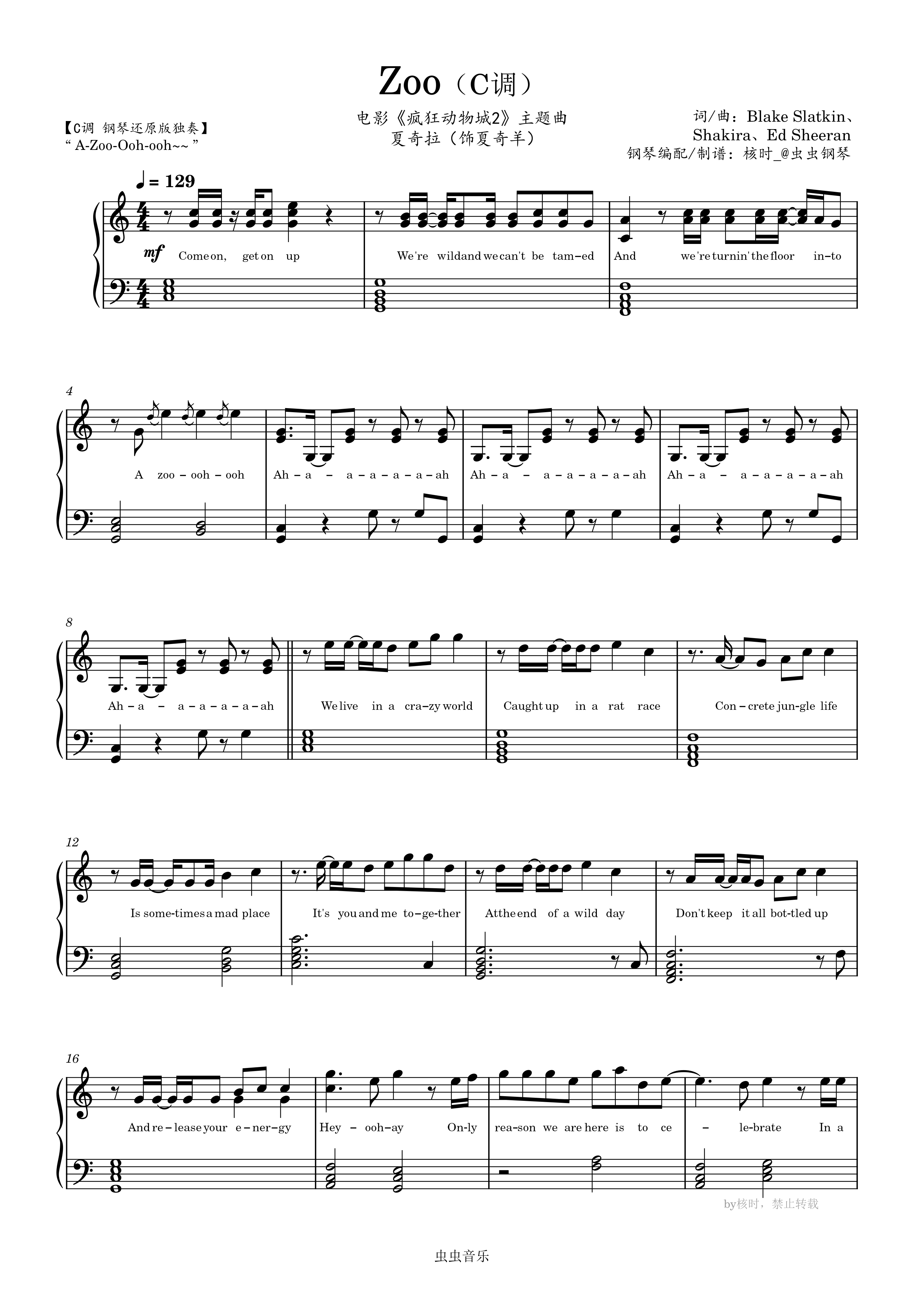 钢琴谱:Zoo(疯狂动物城2主题曲,C调完整独奏附歌词)【核时完整精编】