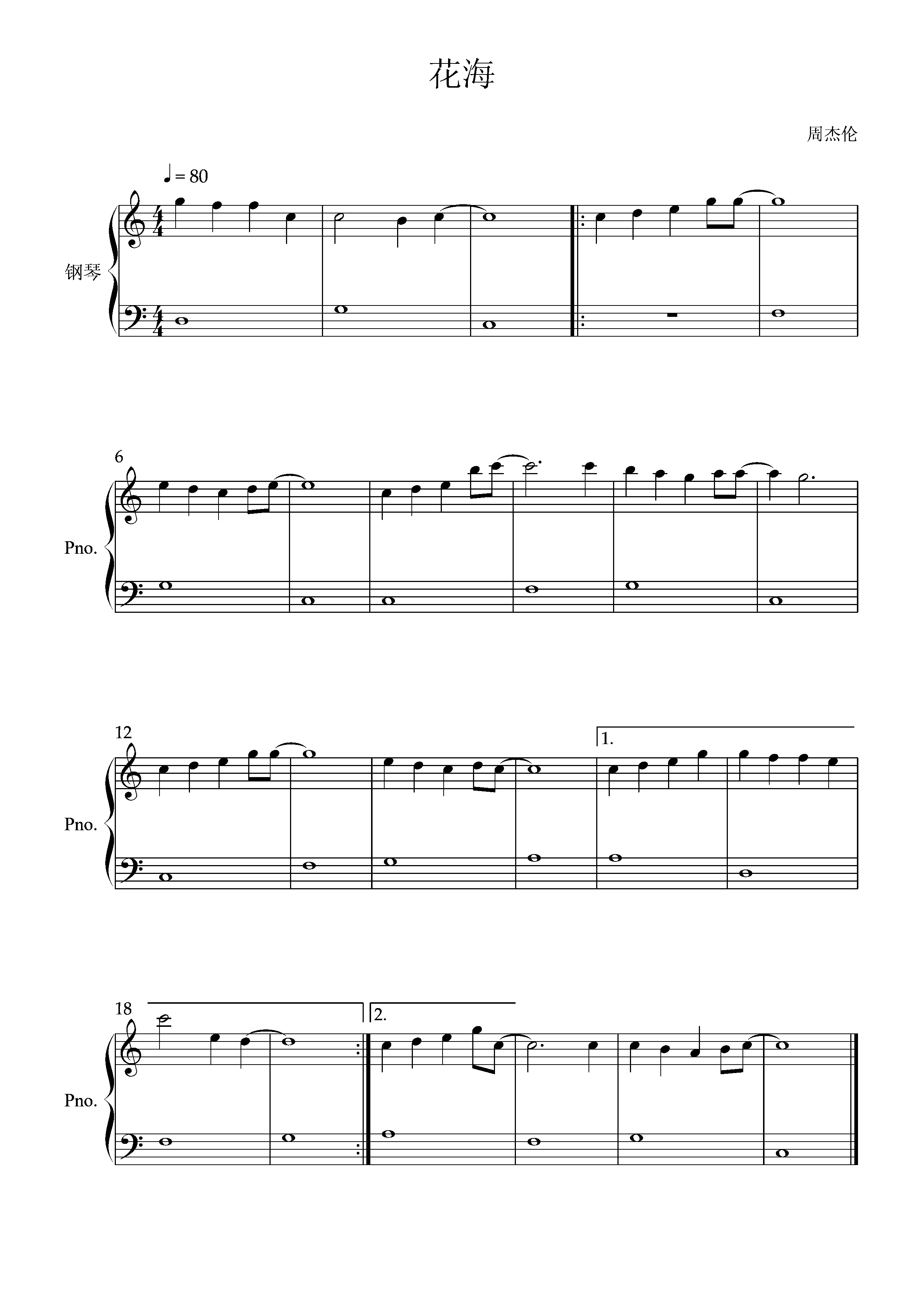 • 花海钢琴简谱 A调 数字双手 周杰伦