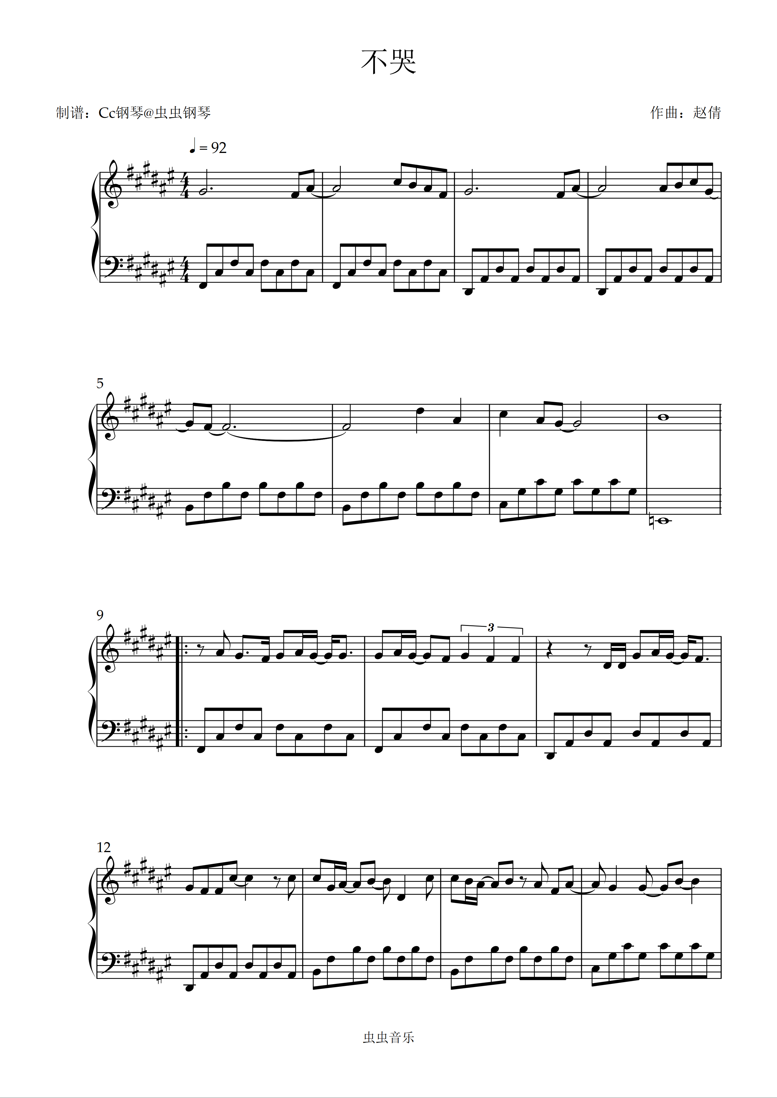 • 不哭钢琴简谱 C调 数字双手 泽大大