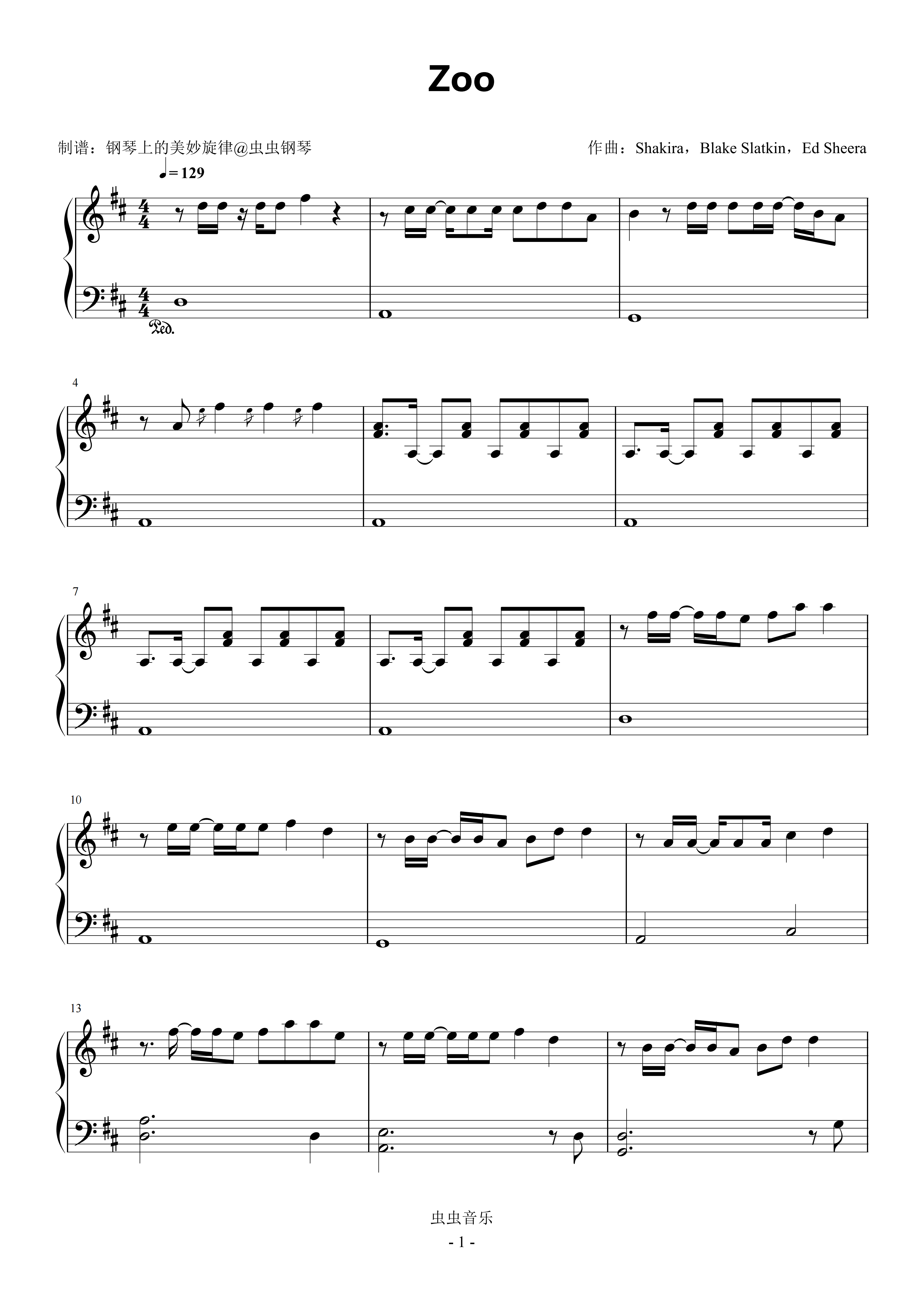 钢琴谱:ZOO 原调简易版 Shakira 疯狂动物城2