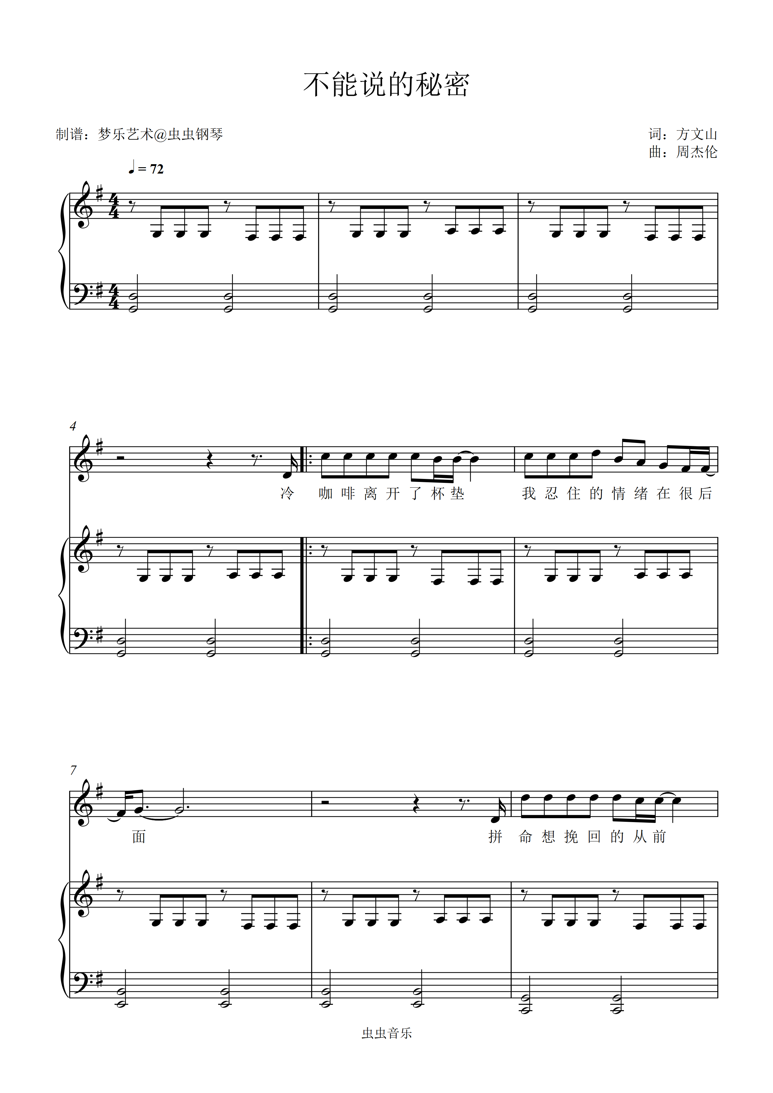 • 不能说的秘密钢琴简谱 G调 数字双手 方文山