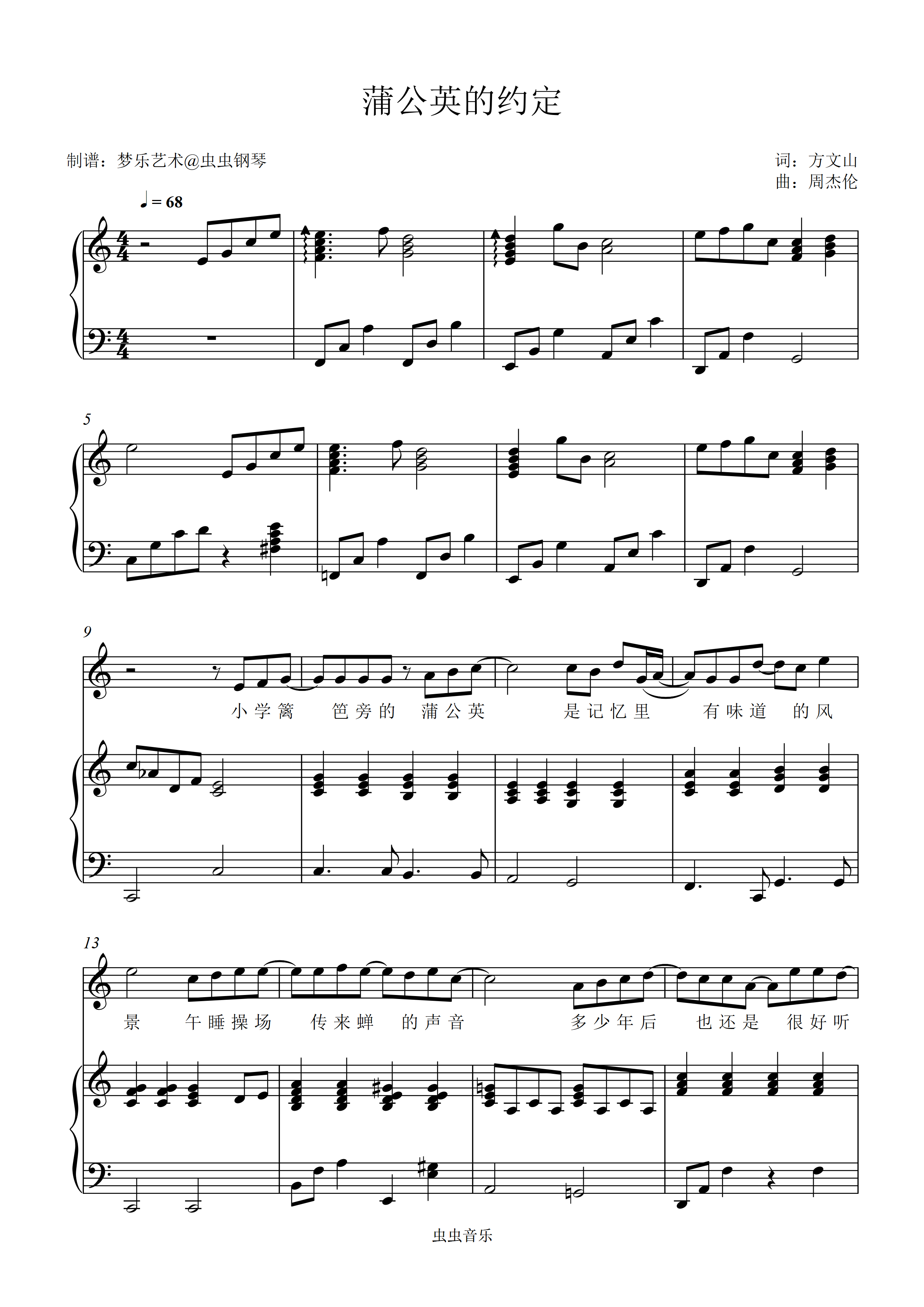• 蒲公英得约定钢琴简谱 C调 数字双手 周杰伦