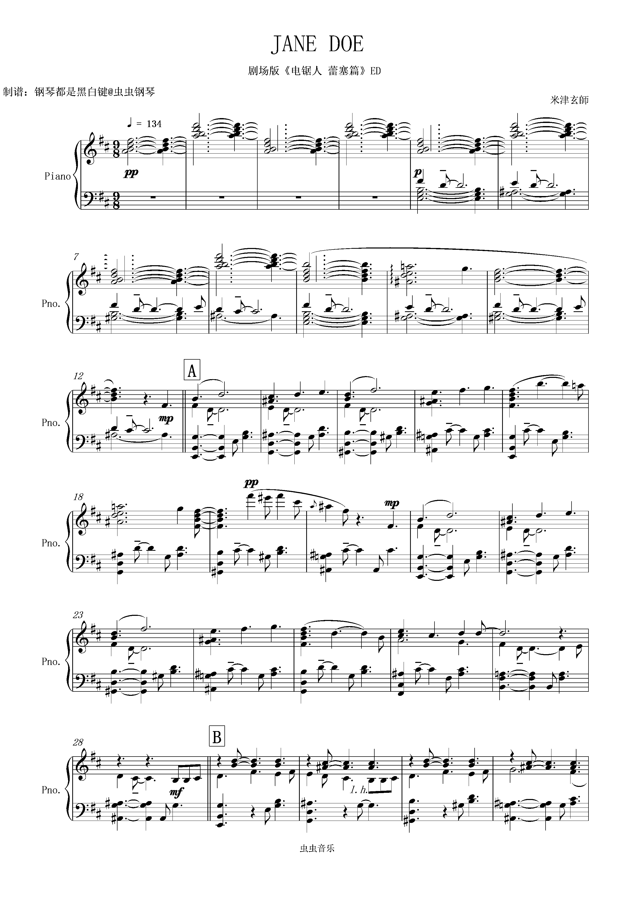 钢琴谱:【Animenz版】JANE DOE - 剧场版《电锯人 蕾塞篇》ED