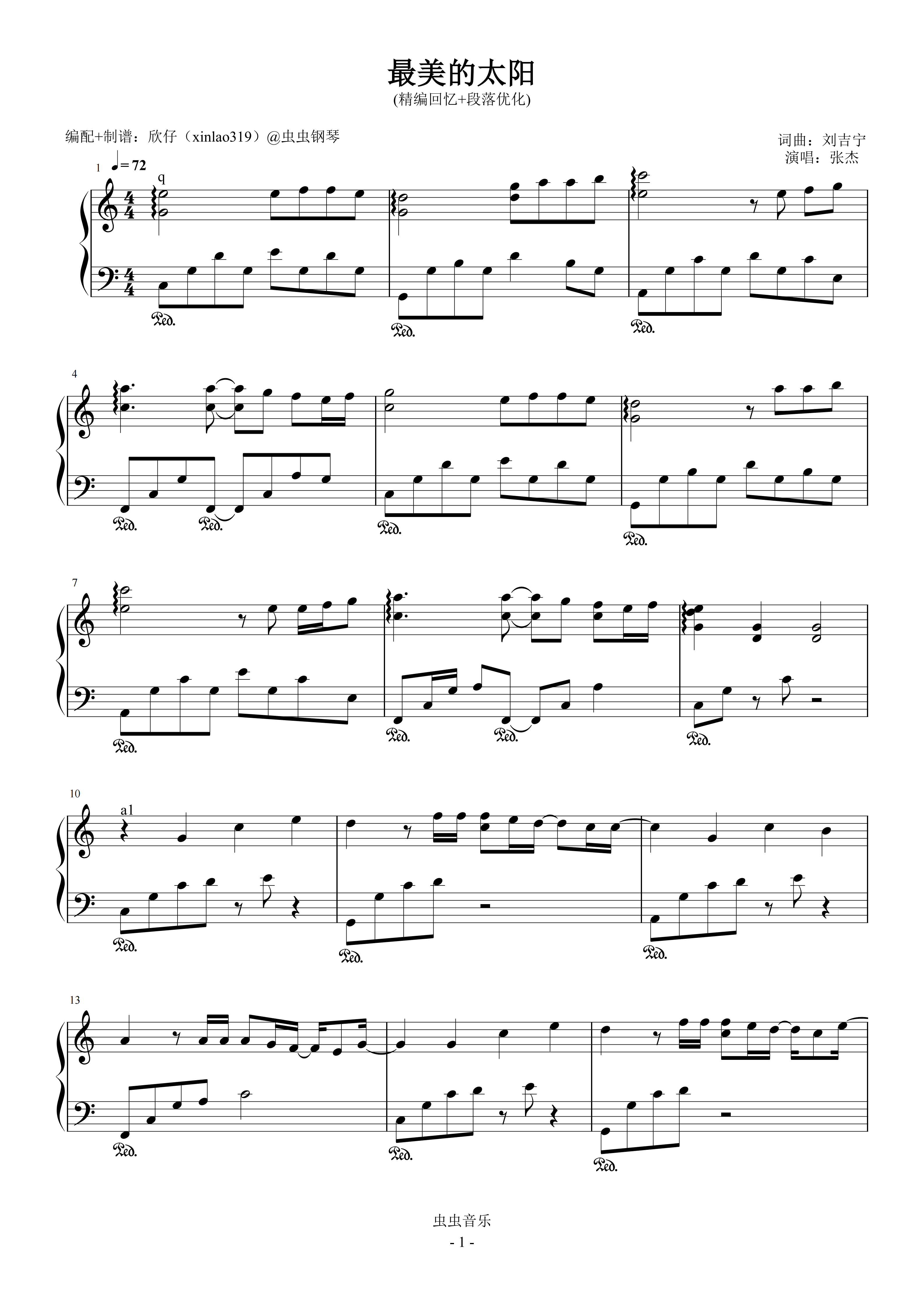 钢琴谱:最美的太阳(C、张杰、精编回忆+段落优化)