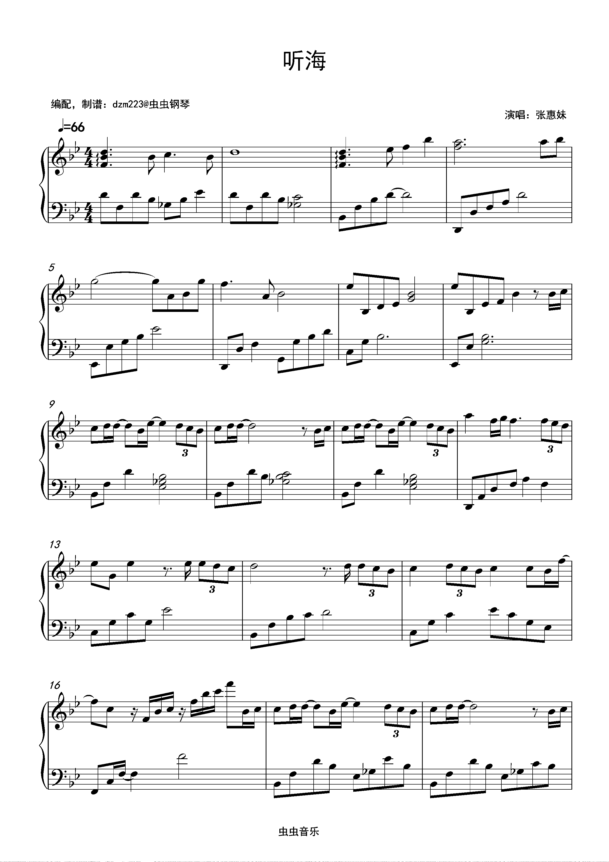 • 听海钢琴简谱 Bb调 数字双手 林秋离