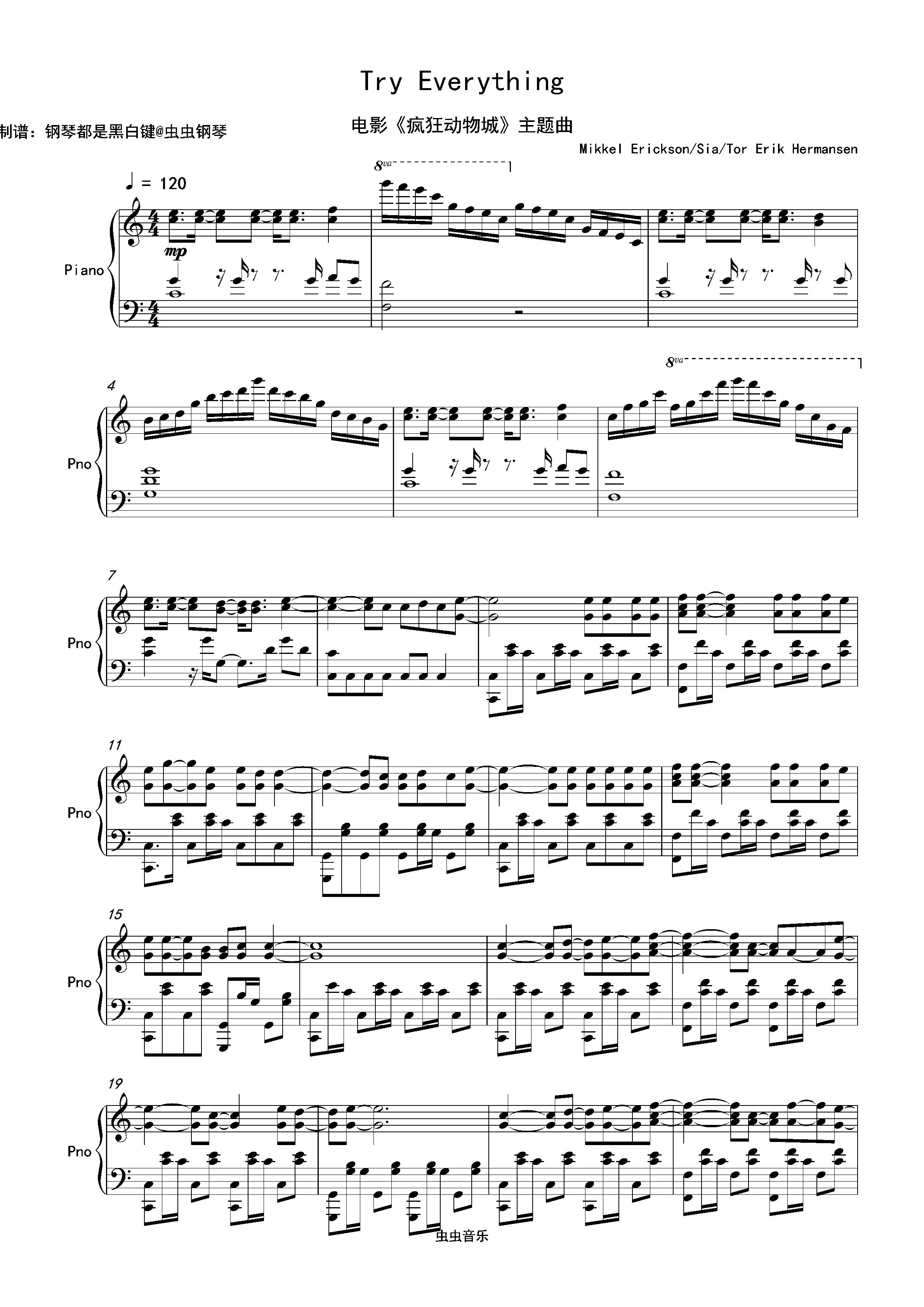 钢琴谱:【疯狂动物城】《try everything》C调炫技版