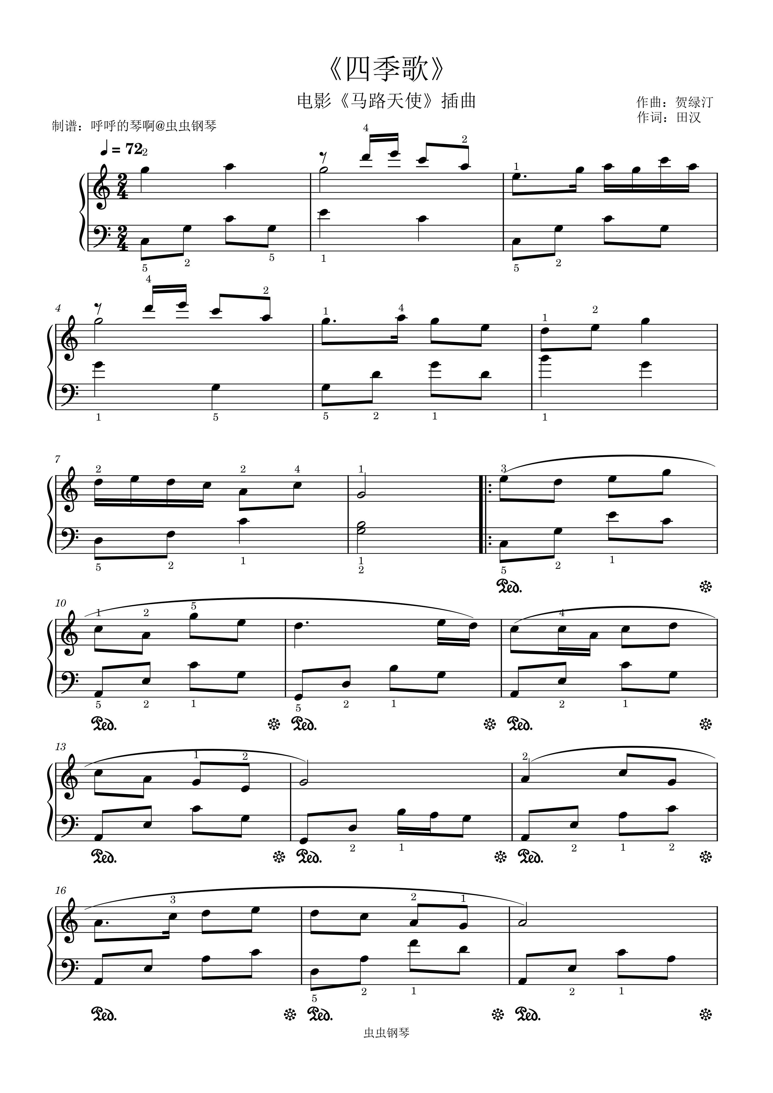 钢琴谱:《四季歌》——电影《马路天使》插曲 简易C调