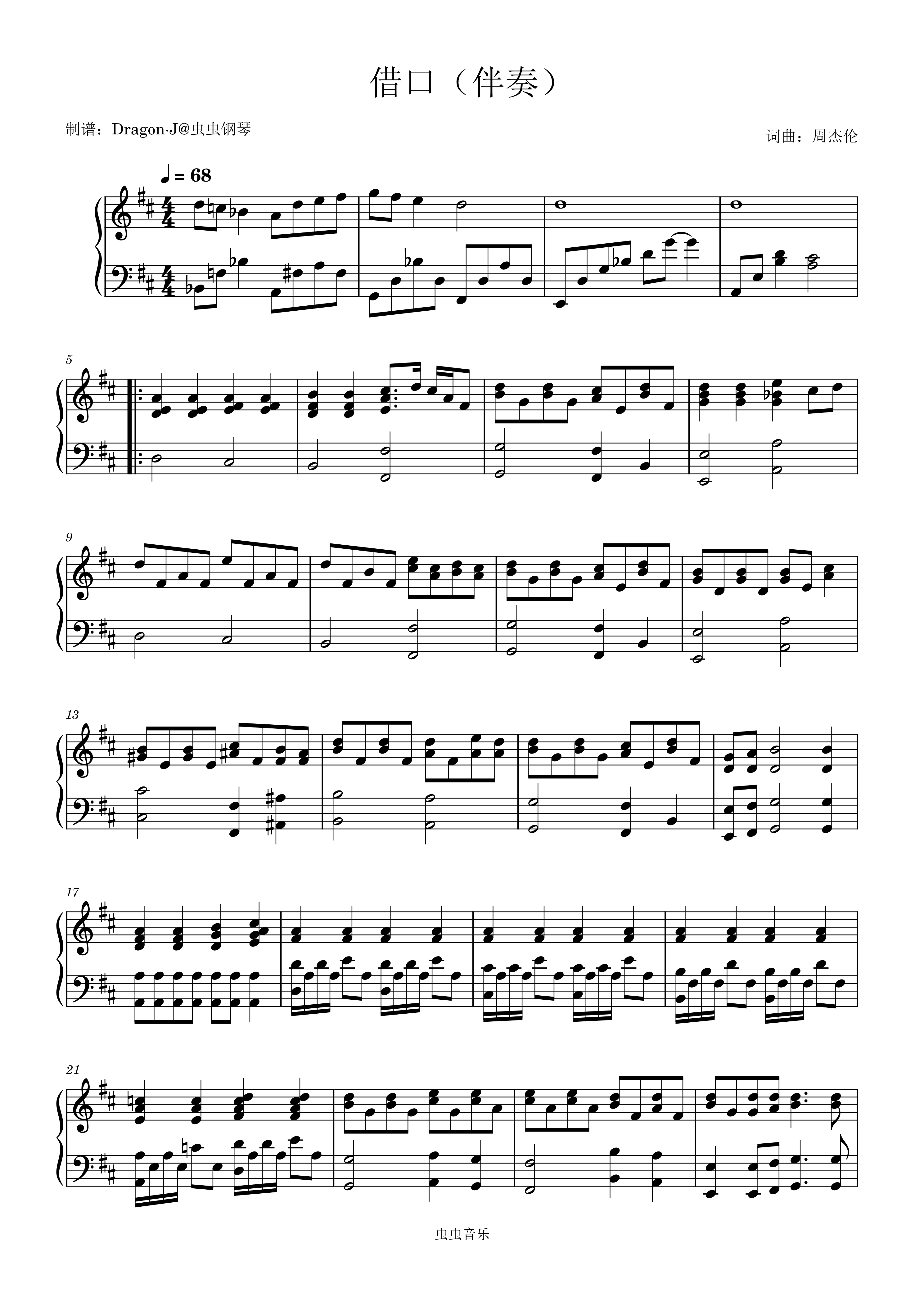 钢琴谱:周杰伦—《借口》 完美D调弹唱