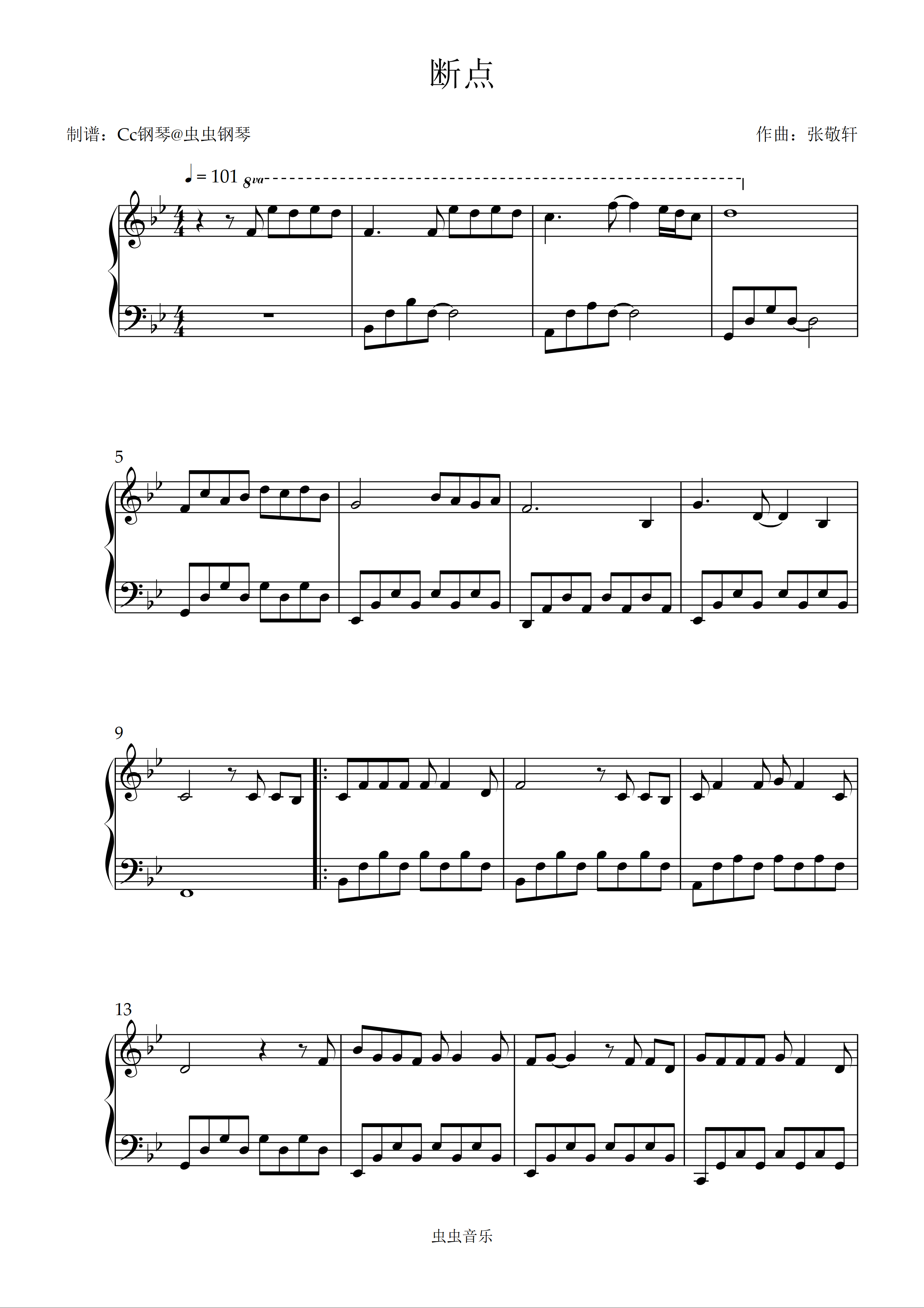 • 断点钢琴简谱 Bb调 数字双手 张敬轩