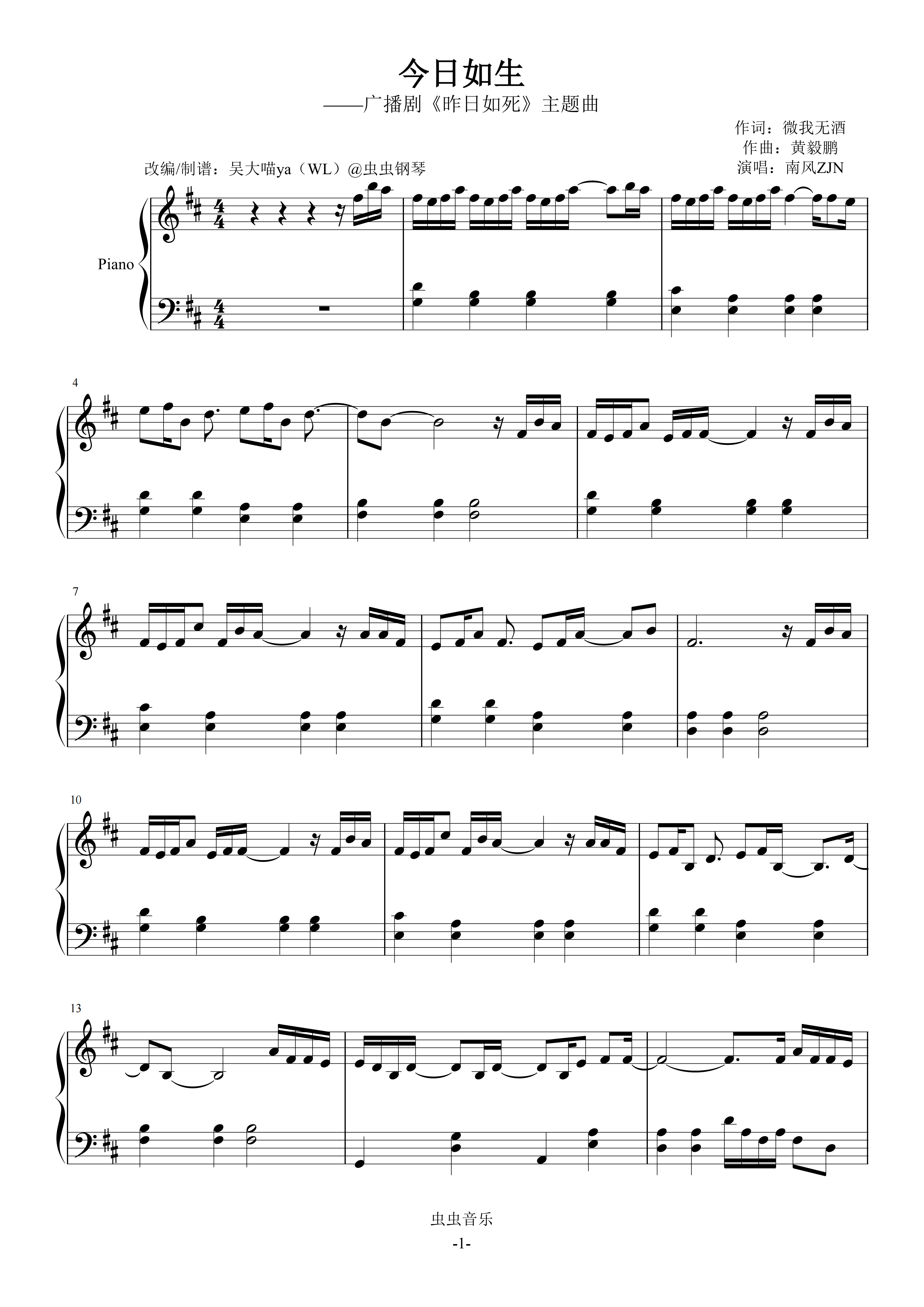 钢琴谱:今日如生-广播剧《昨日如死》主题曲 原调