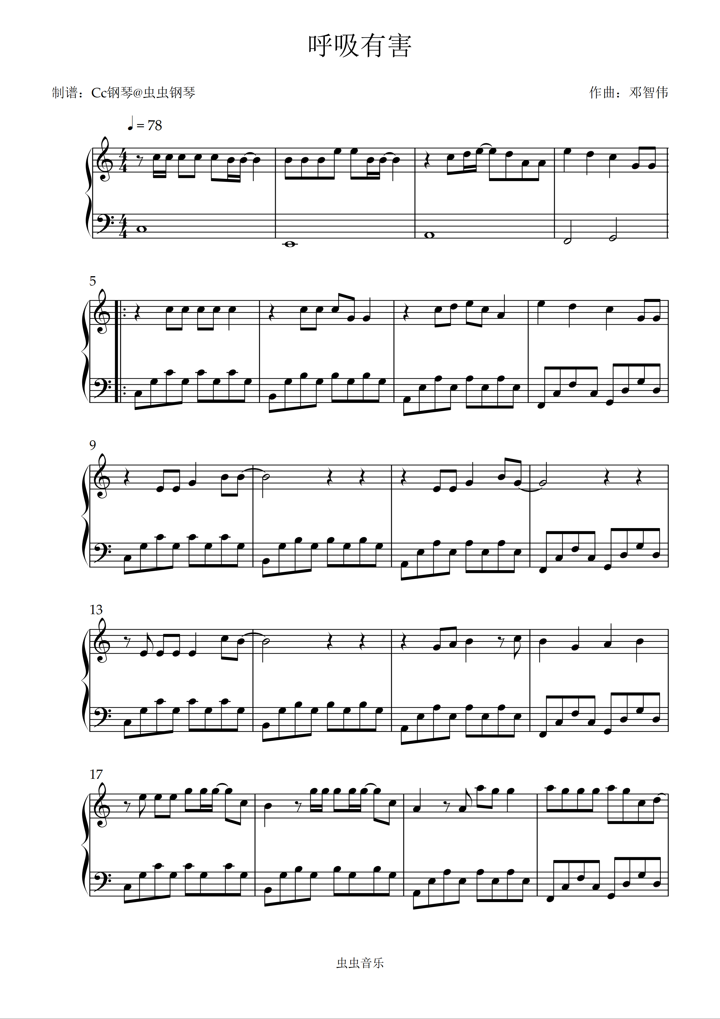 • 呼吸有害钢琴简谱 C调 数字双手 羅健成
