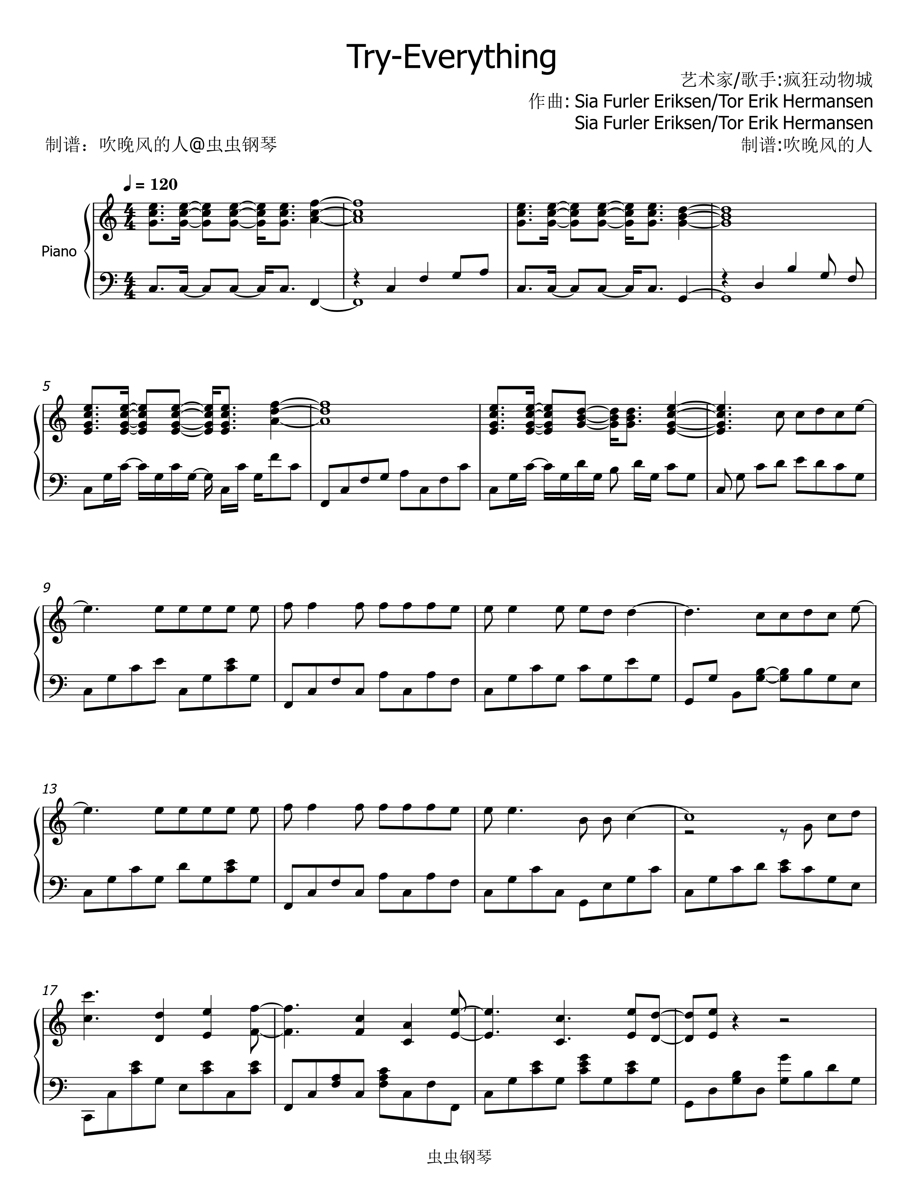 钢琴谱:《Try-Everything》C调 疯狂动物城2
