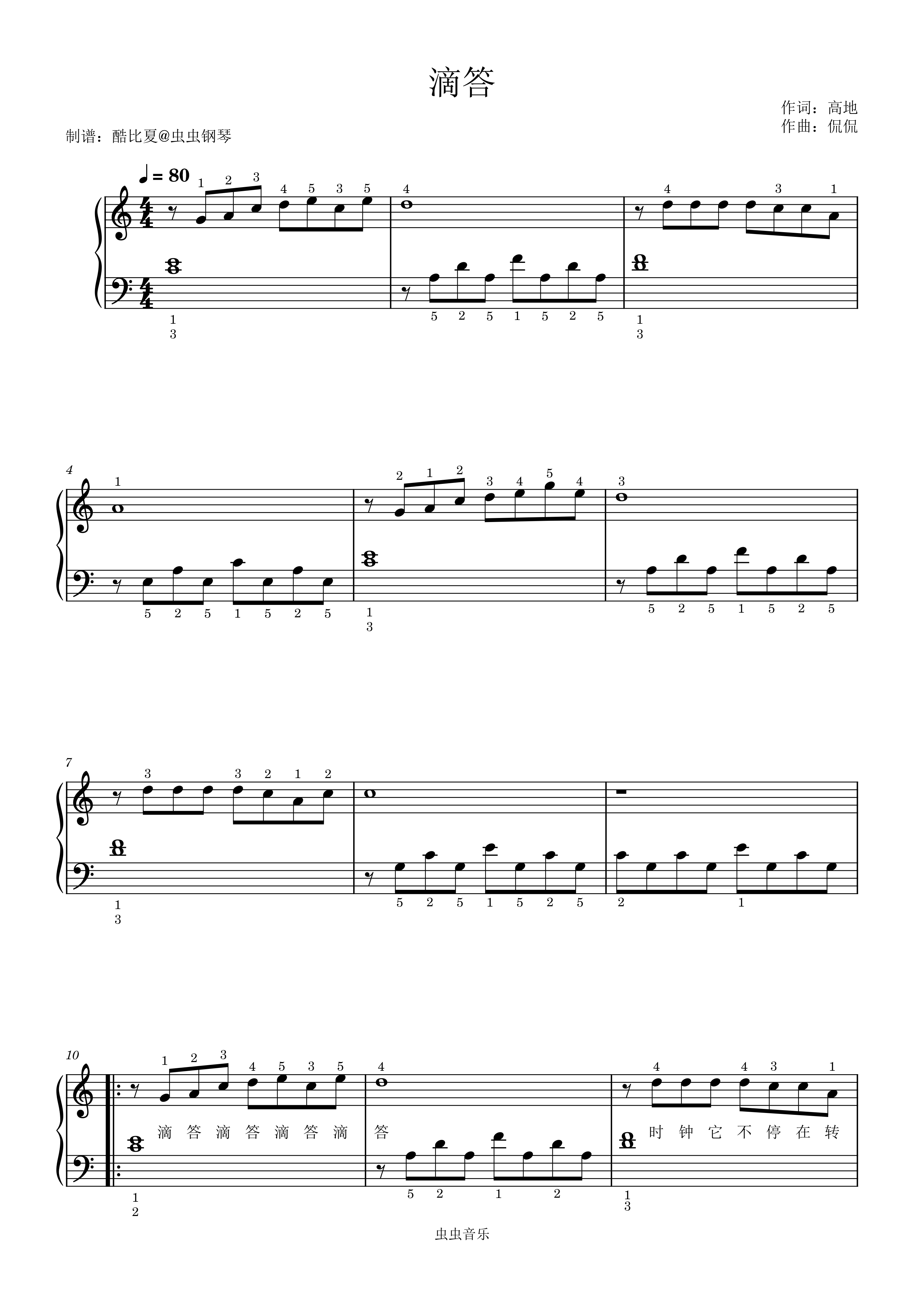 • 滴答钢琴简谱 C调 数字双手 高帝