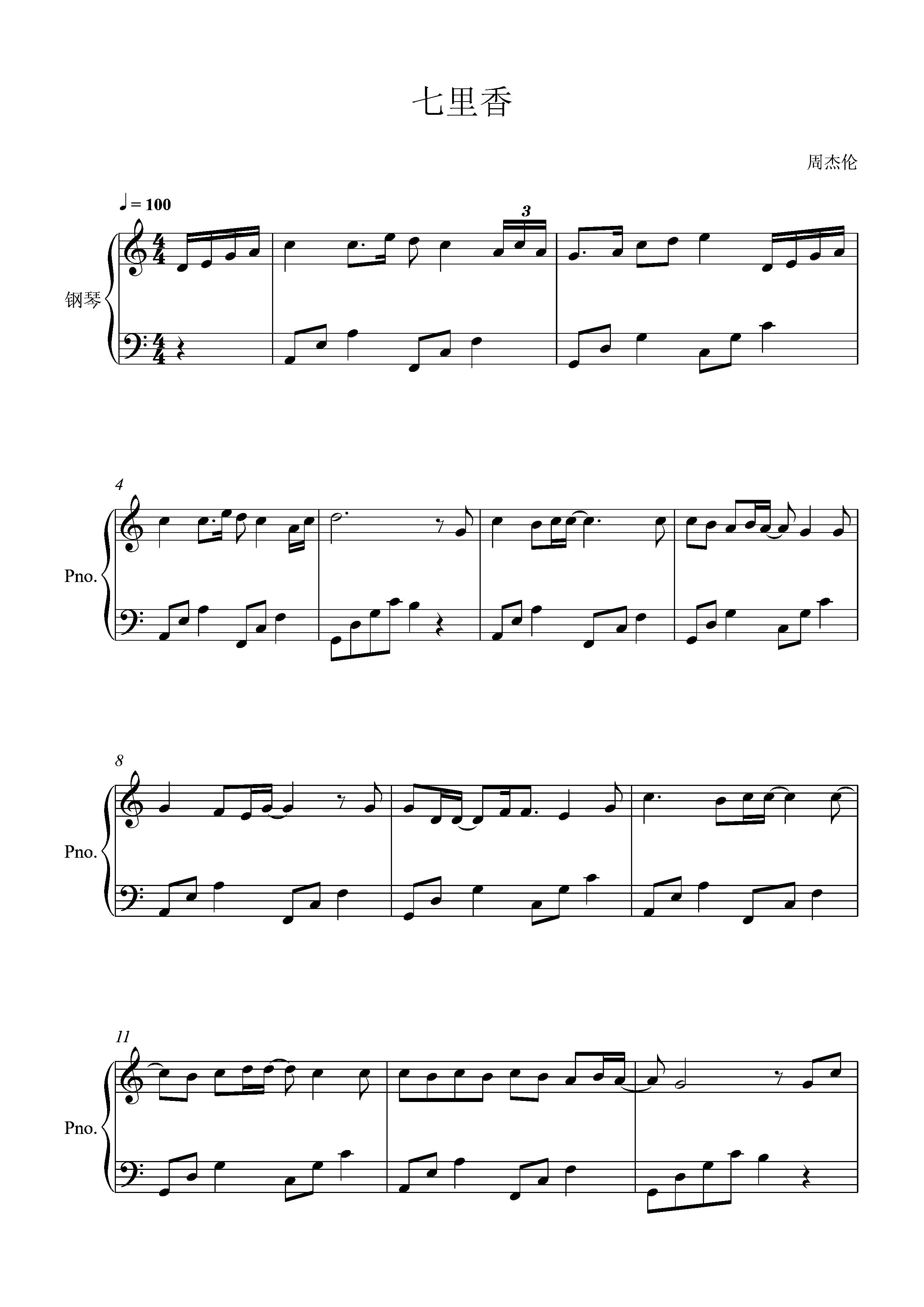 • 七里香钢琴简谱 C调 数字双手 方文山