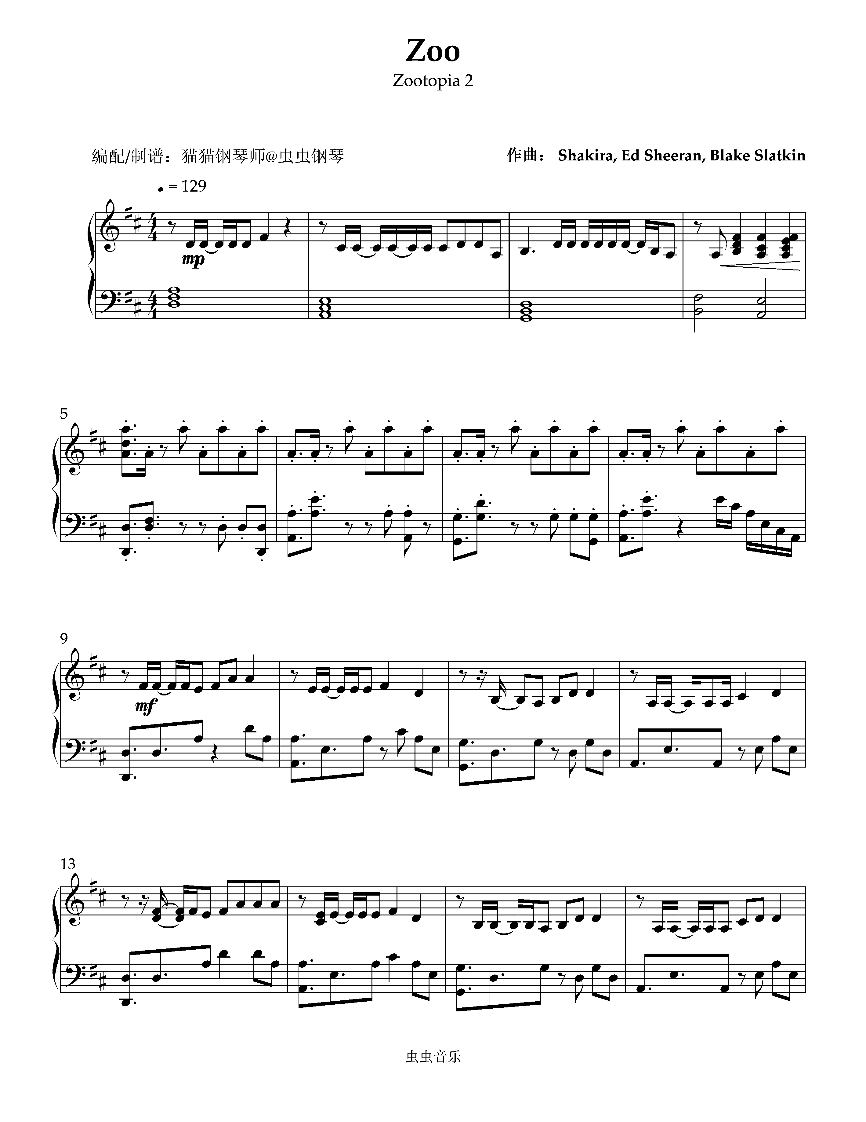 • Zoo钢琴简谱 D调 数字双手 Blake Slatkin/Shakira/Ed Sheeran