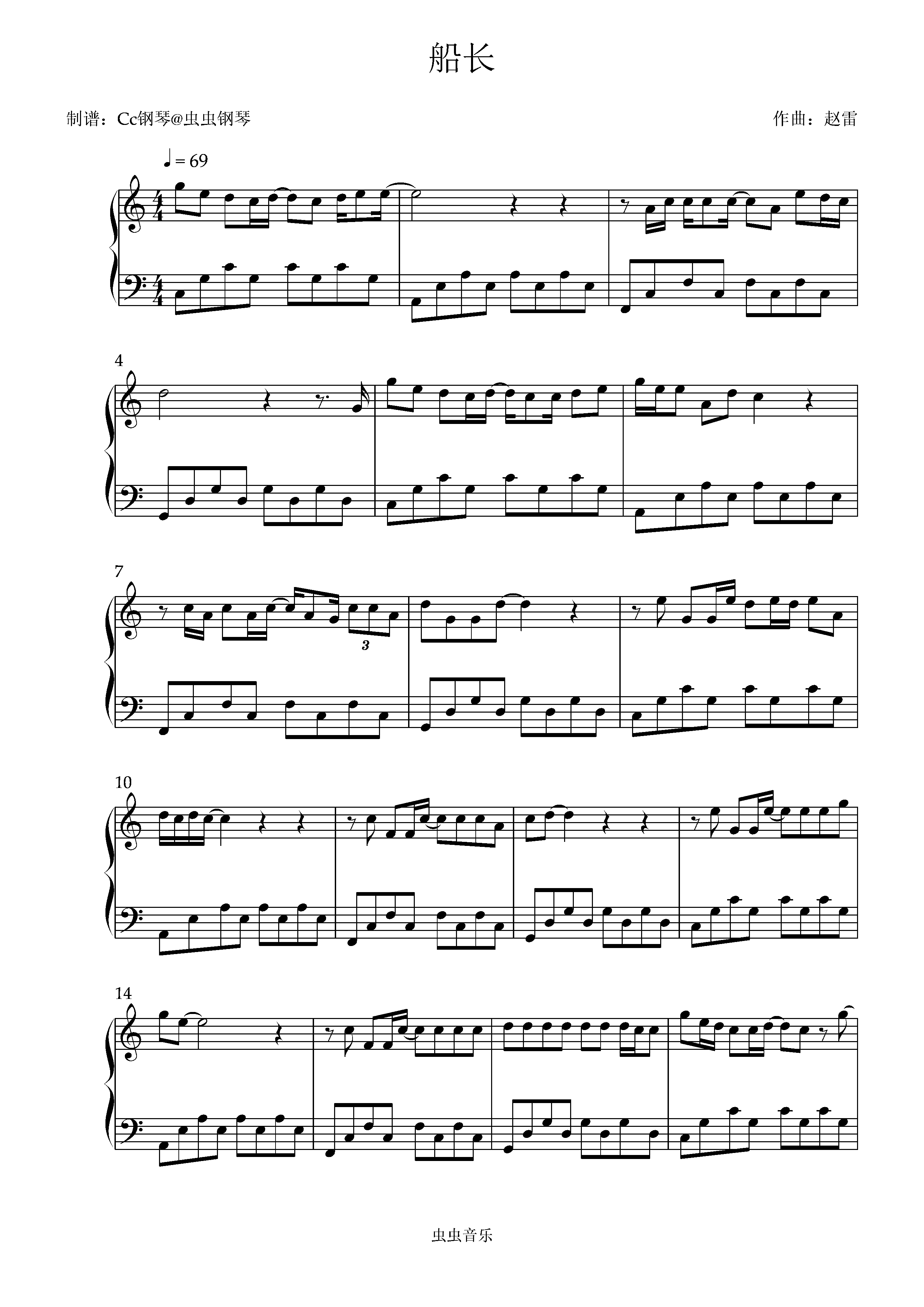 • 海盗船长钢琴简谱 C调 数字双手 功夫胖