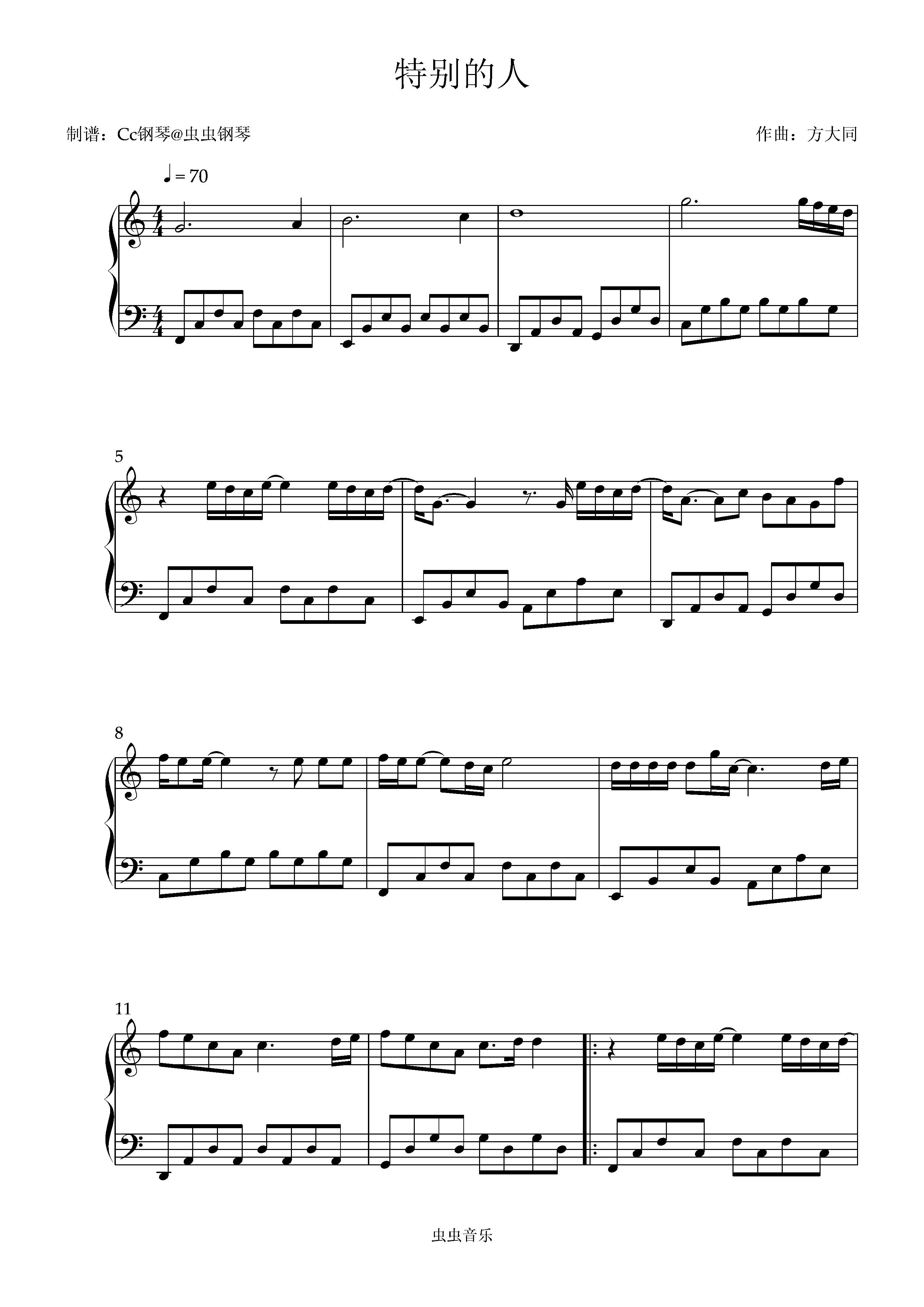 • 特别的人钢琴简谱 C调 数字双手 方大同