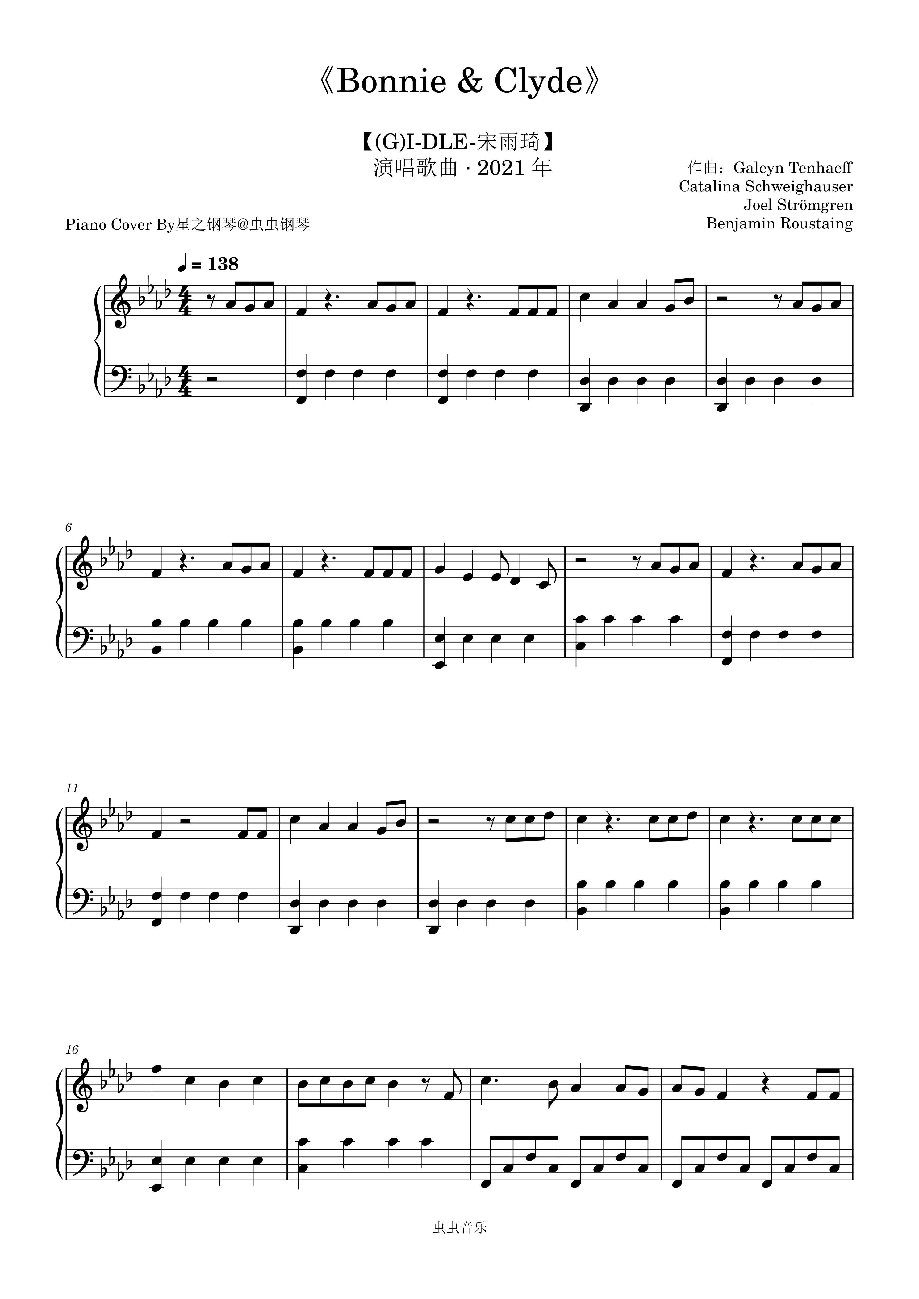 • Bonnie & Clyde钢琴简谱 f调 数字双手 Galeyn Tenhaeff/Catalina Schweighauser/Joel Strömgren/Benjamin Roustaing