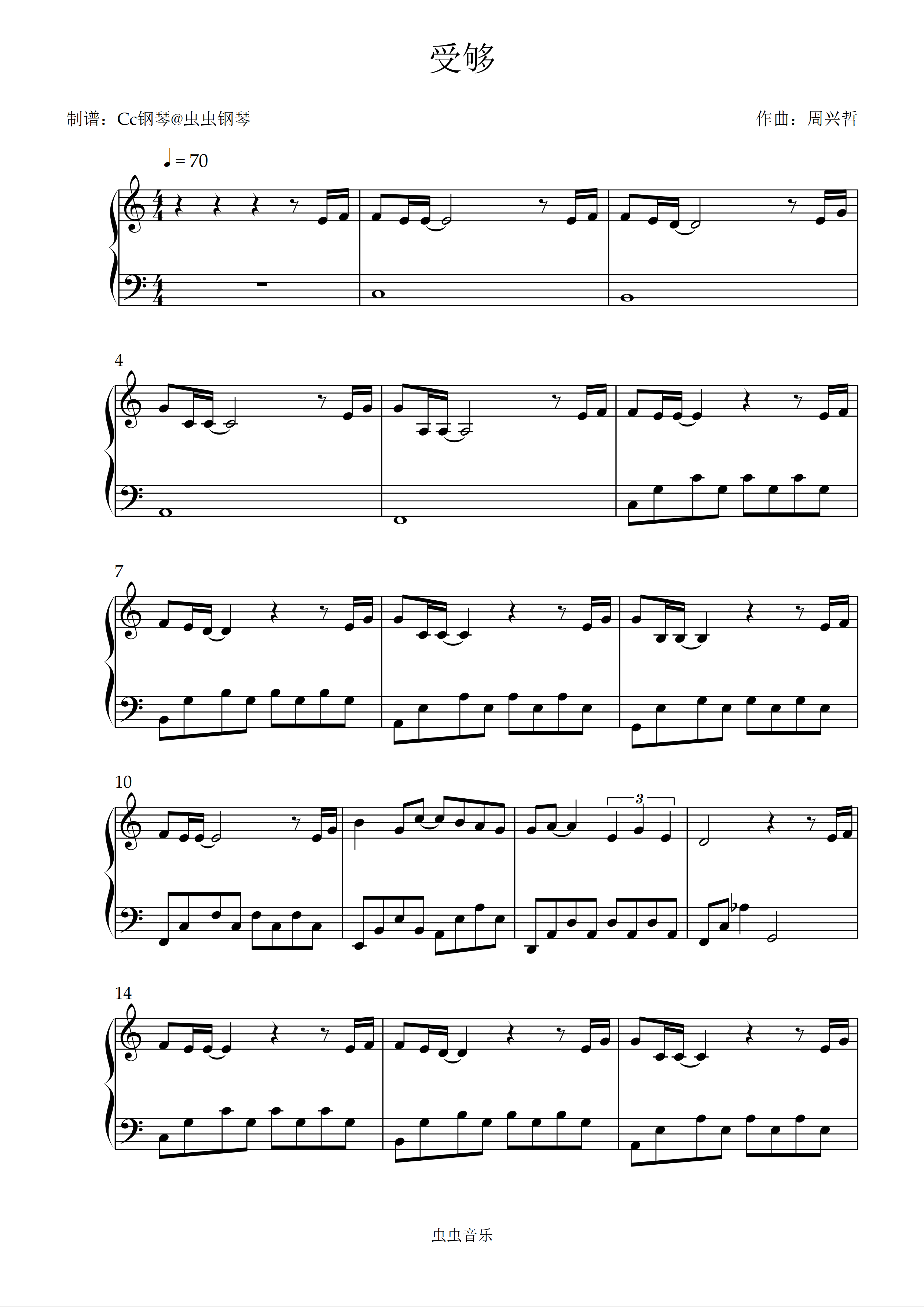 • 受够钢琴简谱 F调 数字双手 Eric 周兴哲/吴易纬