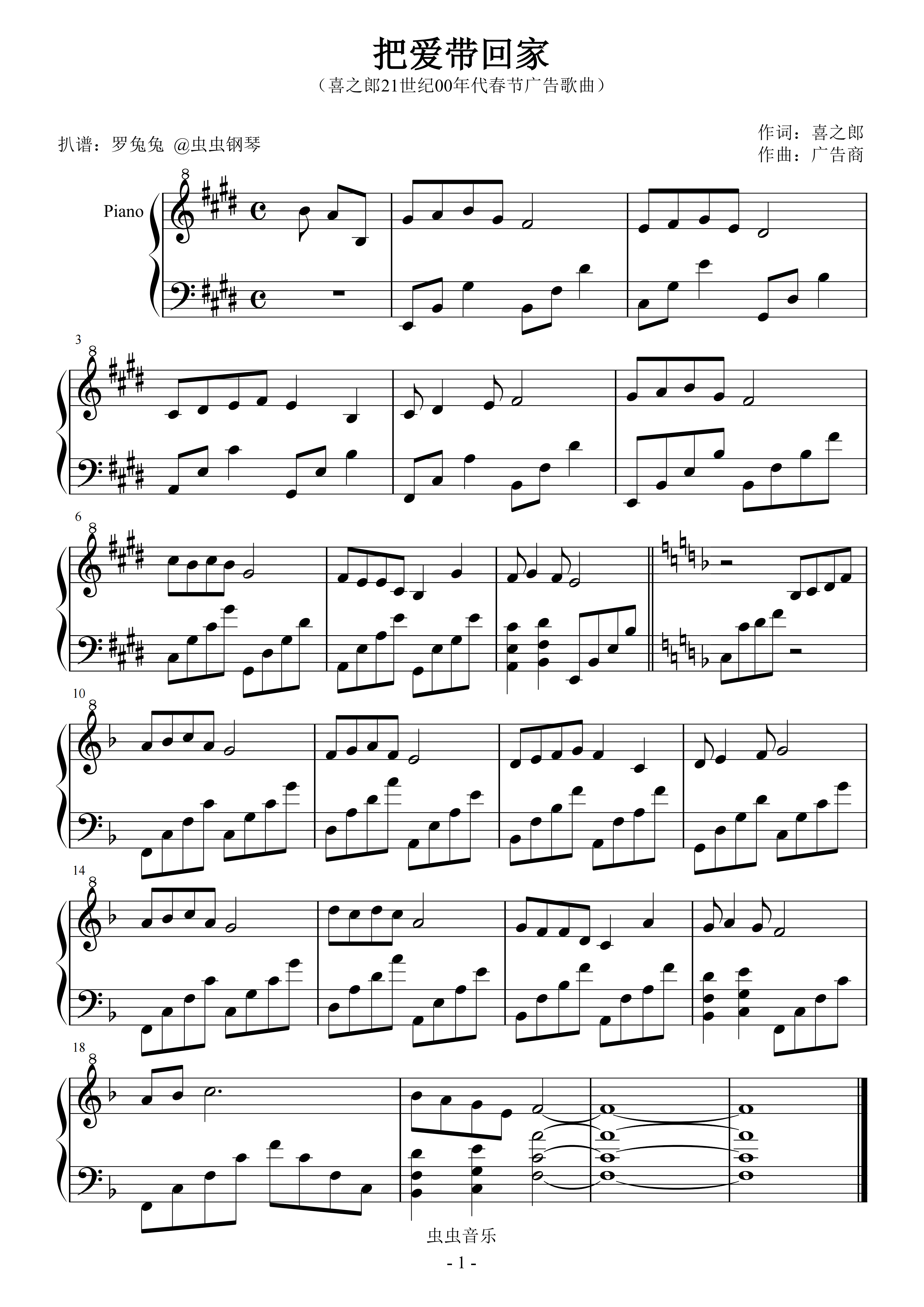 钢琴谱:把爱带回家(喜之郎21世纪00年代春节广告歌曲)
