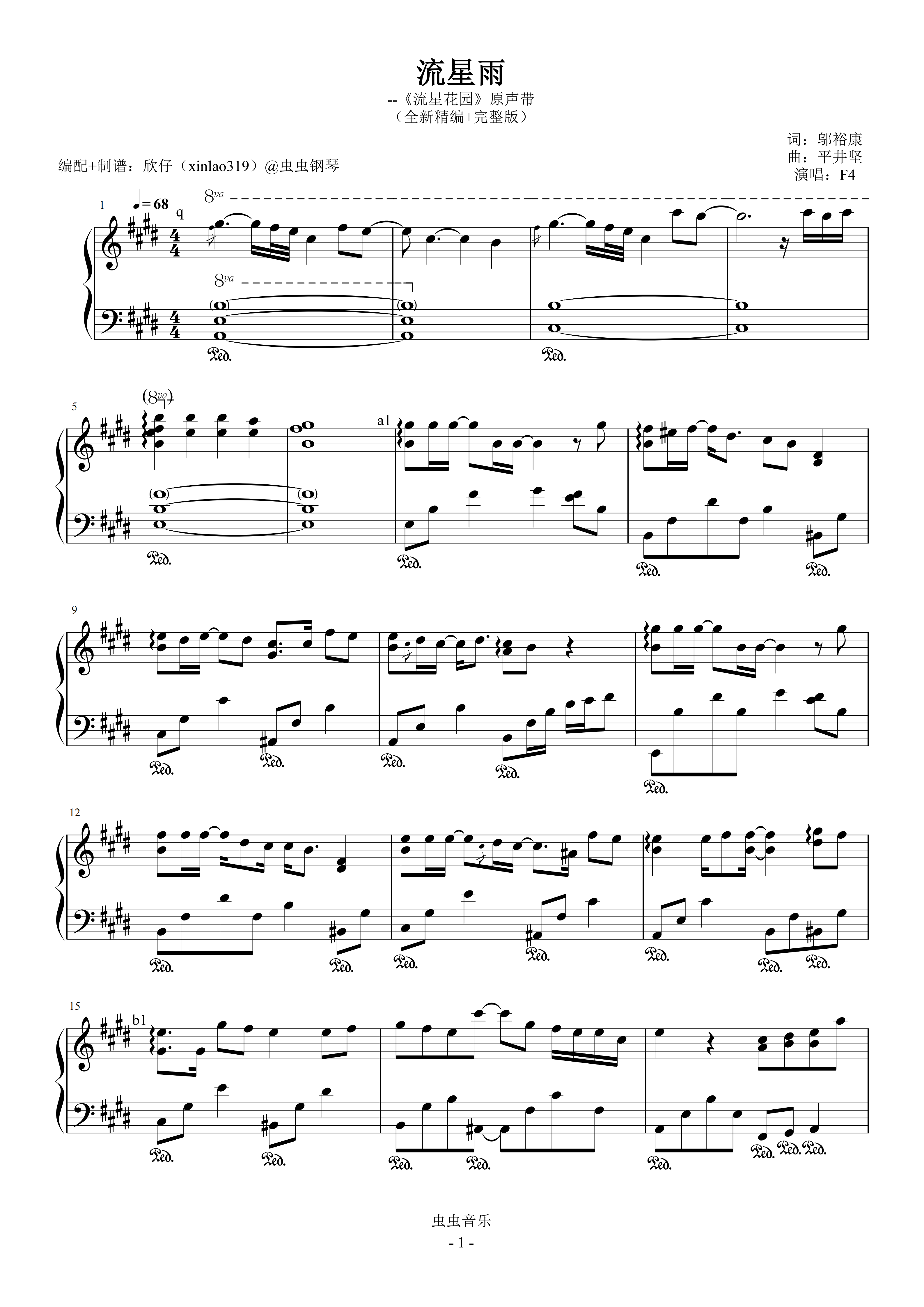 钢琴谱:流星雨(原调E、F4《流星花园》原声带、完整版)