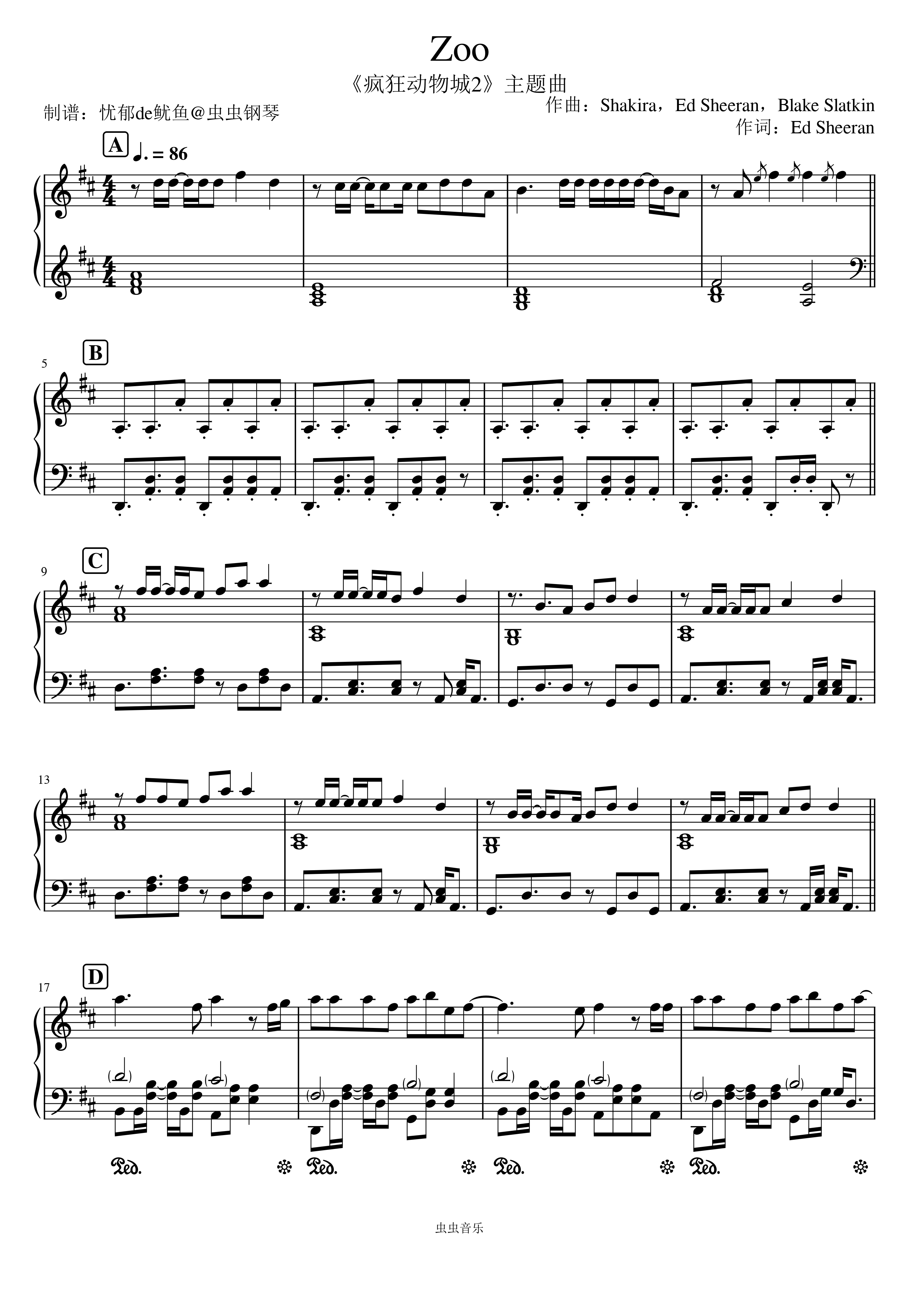 • Zoo钢琴简谱 D调 数字双手 Blake Slatkin/Shakira/Ed Sheeran