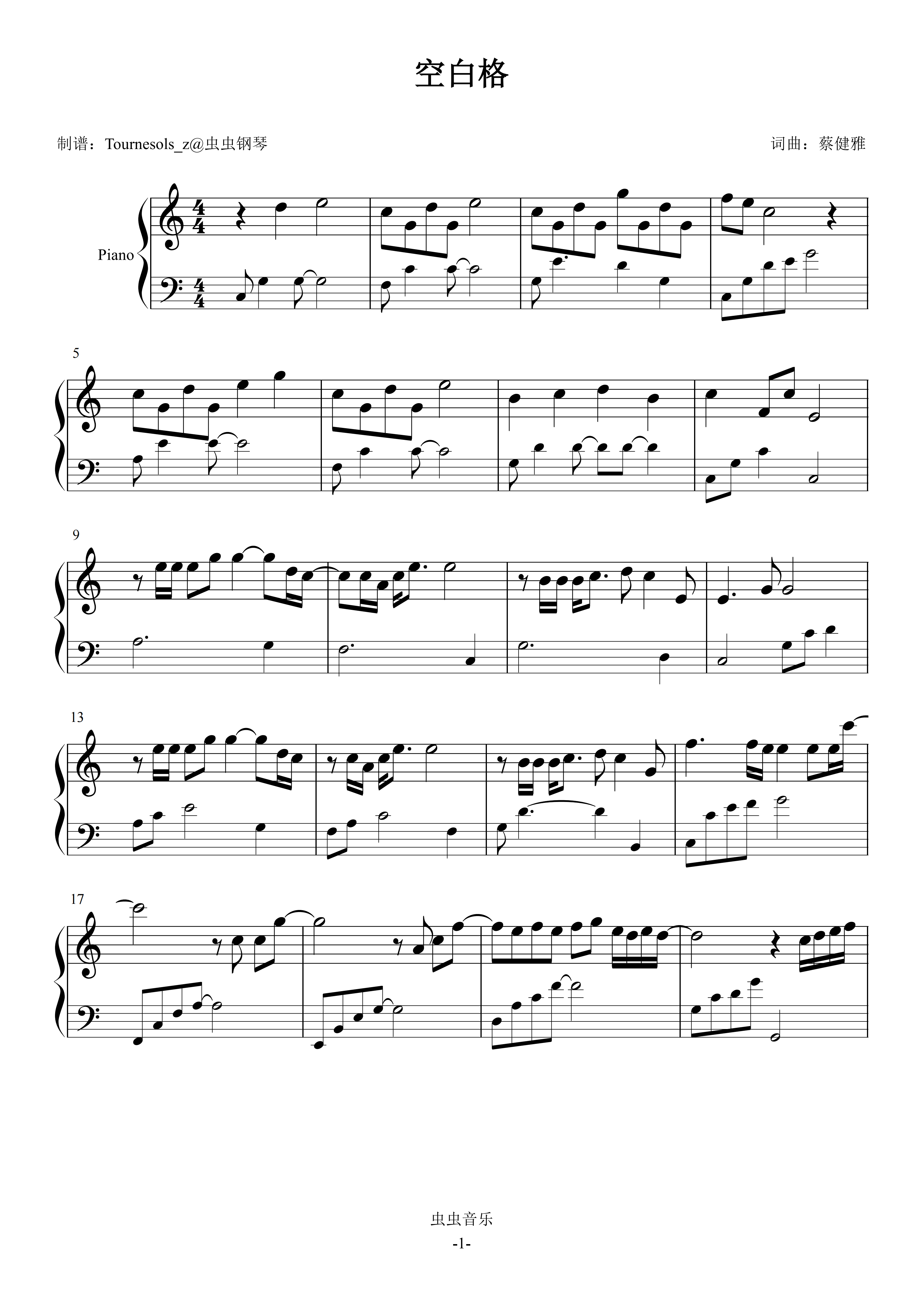 • 空白格钢琴简谱 C调 数字双手 蔡健雅