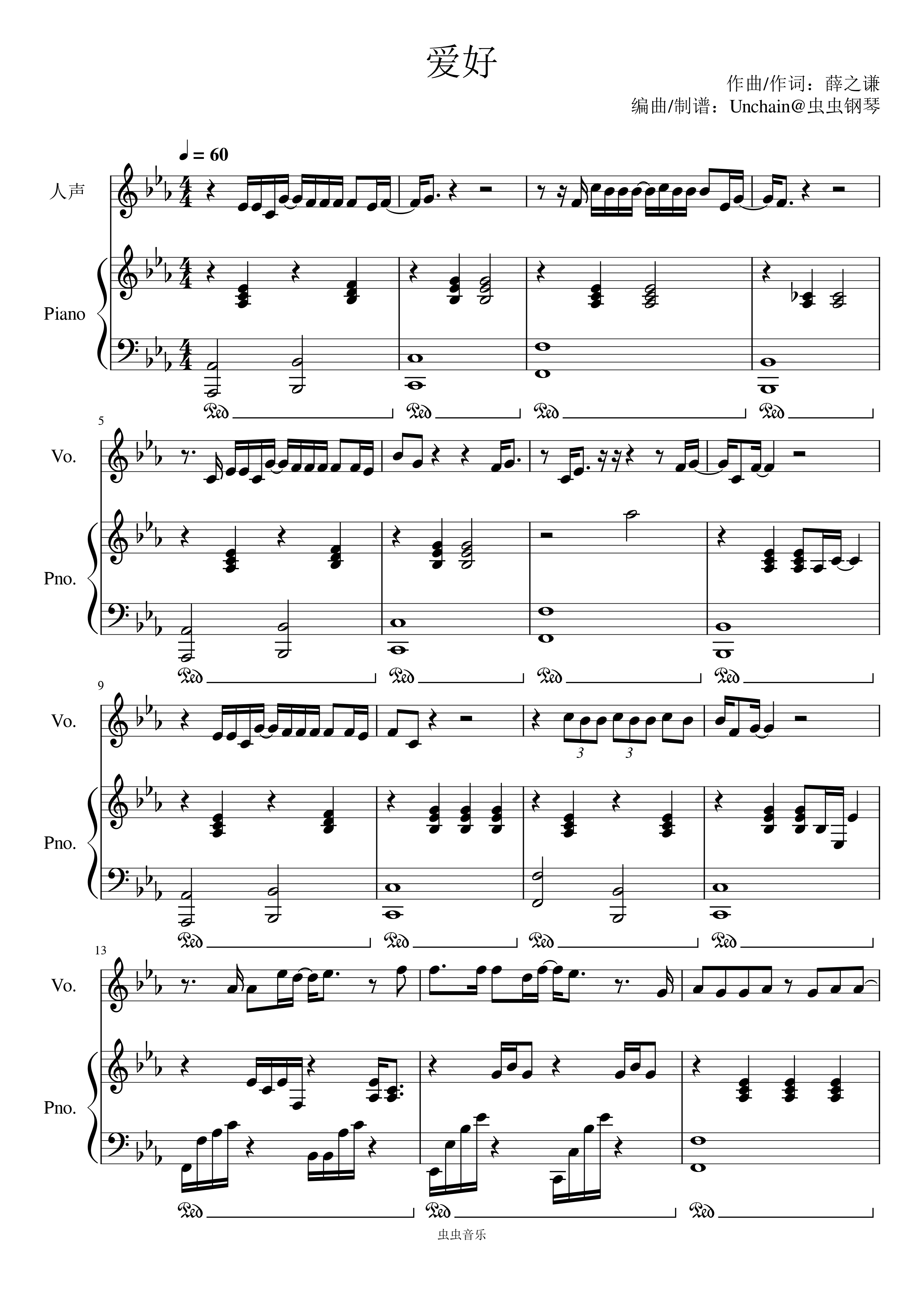爱好钢琴简谱 数字双手 薛之谦