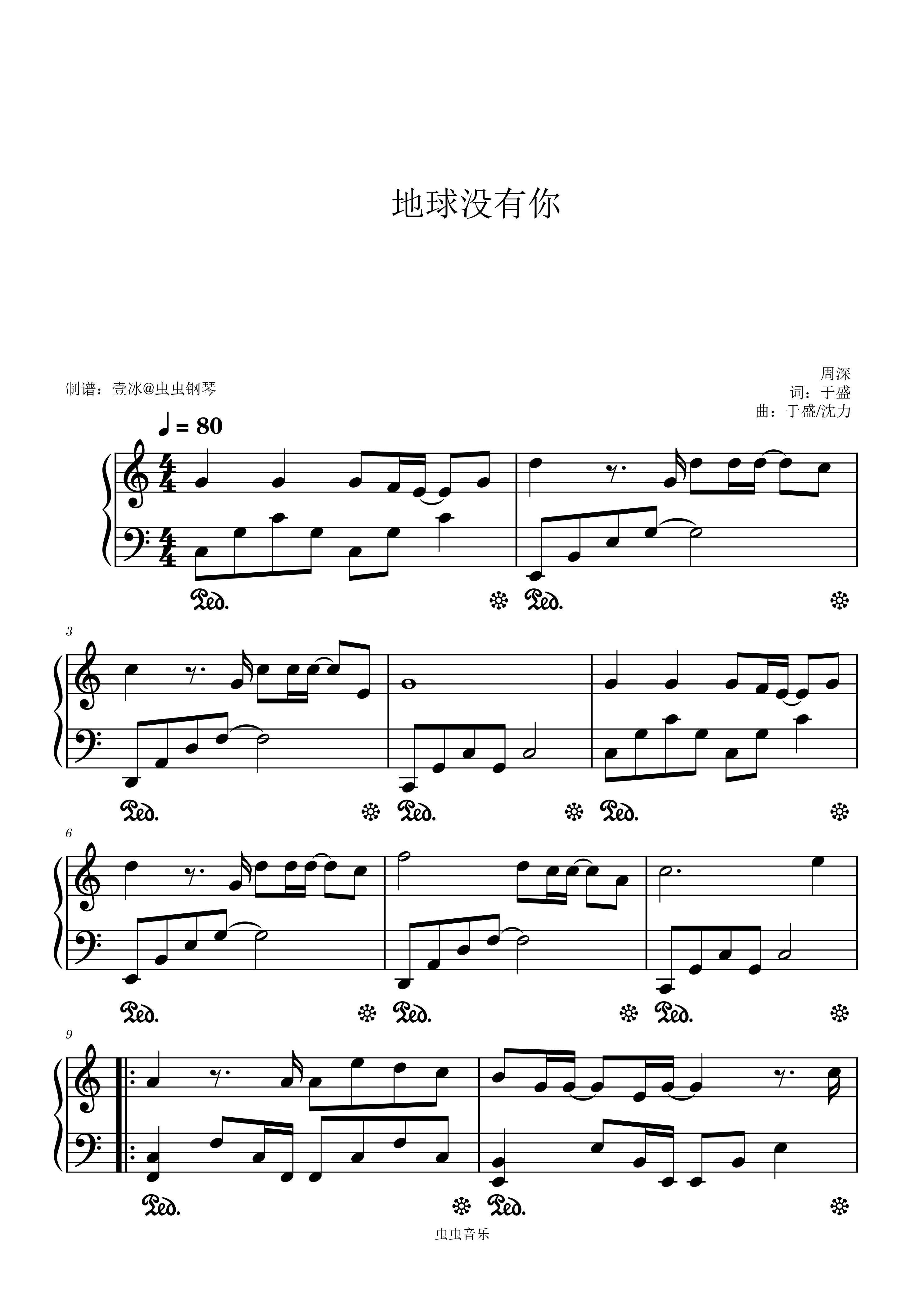 钢琴谱:地球没有你 - 周深 C调