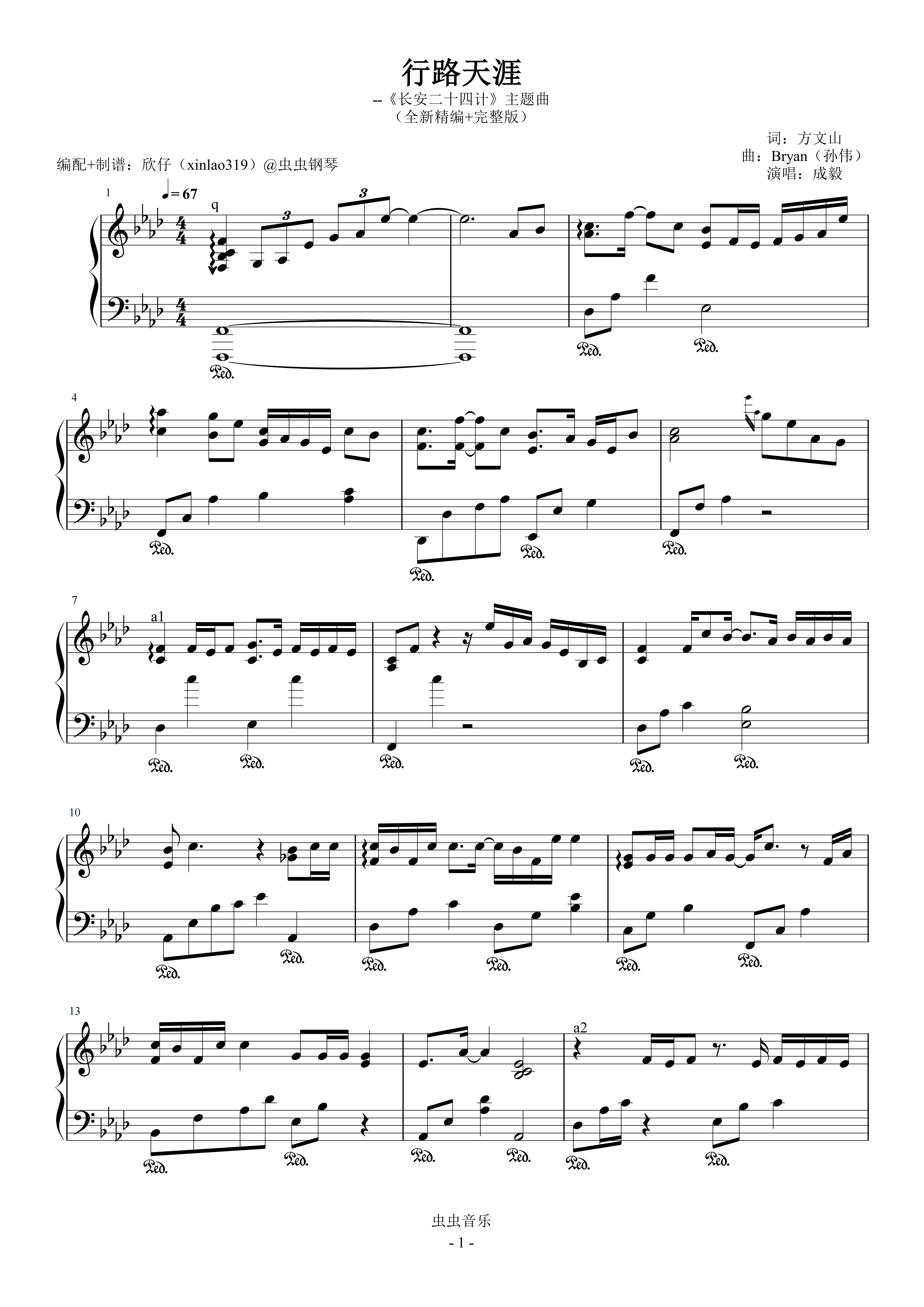 钢琴谱:行路天涯(原调降A、成毅《长安二十四计》主题曲、完整版)