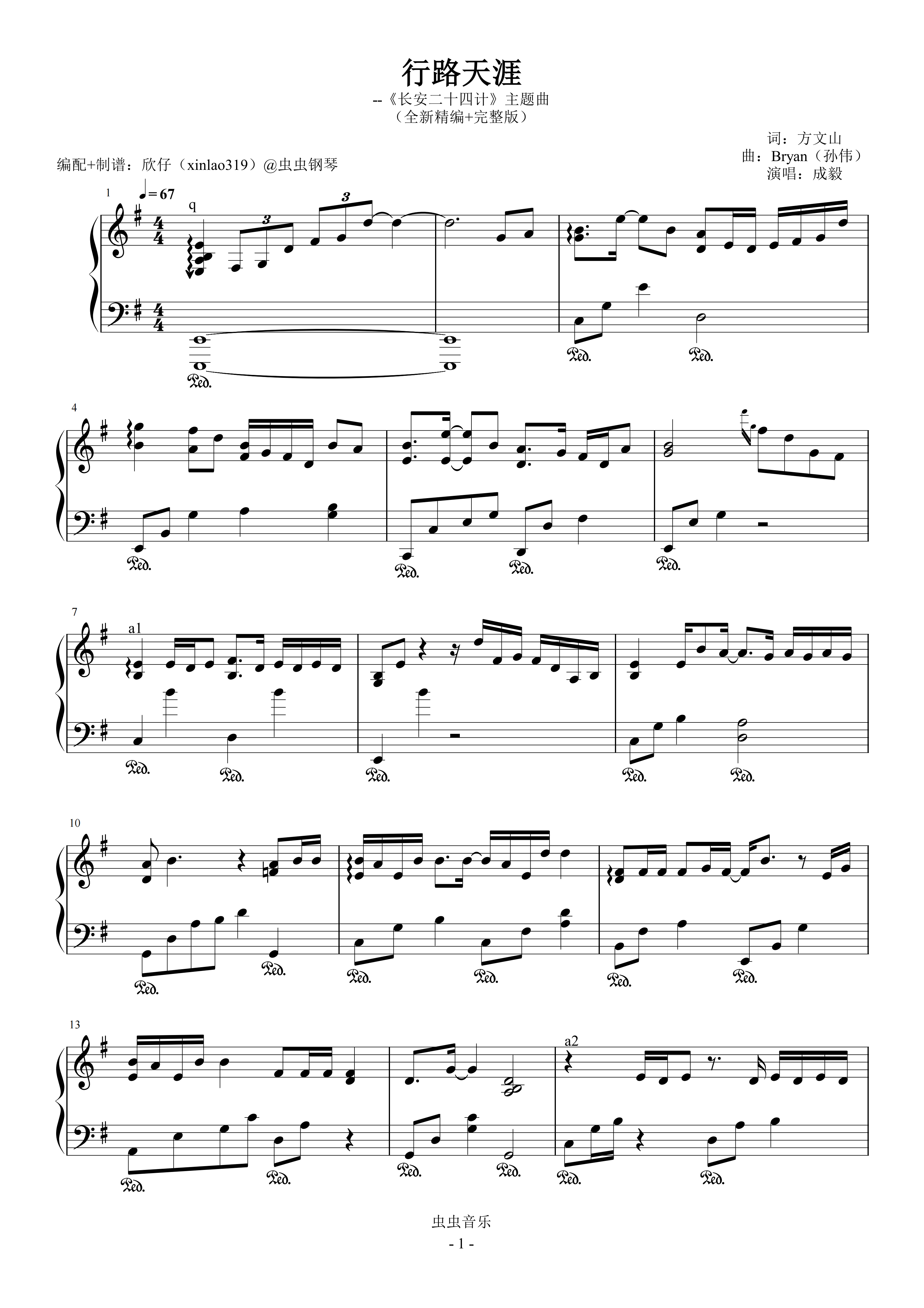 钢琴谱:行路天涯(G、成毅《长安二十四计》主题曲、完整版)
