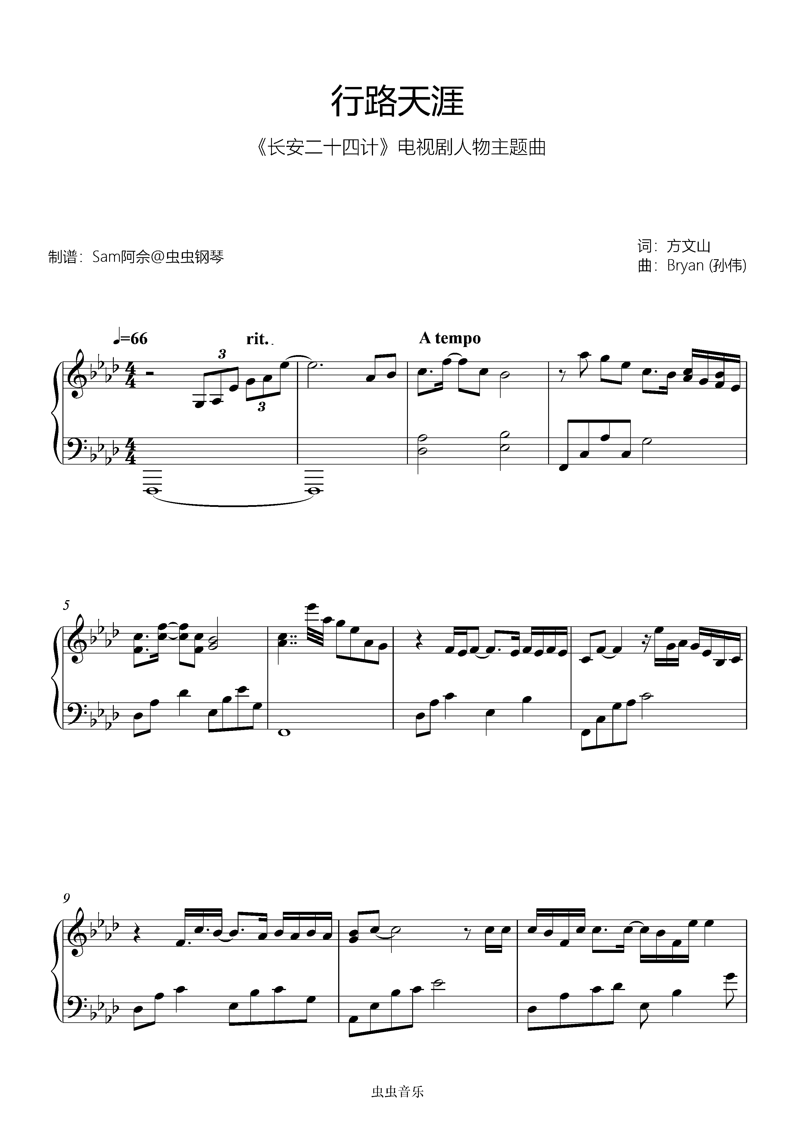 钢琴谱:原调《行路天涯》成毅