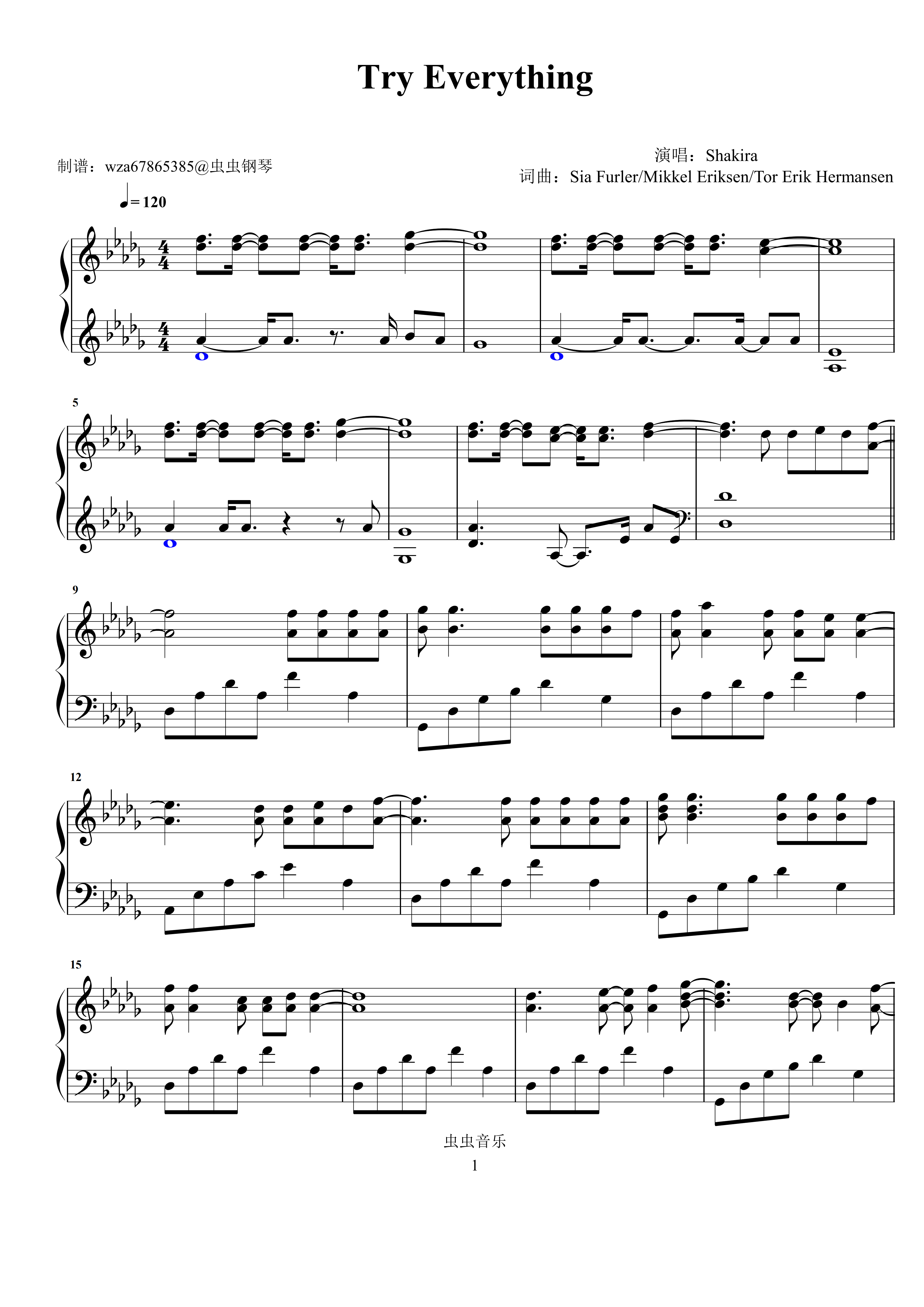 • Try Everything钢琴简谱 C调 数字双手 Sia Furler