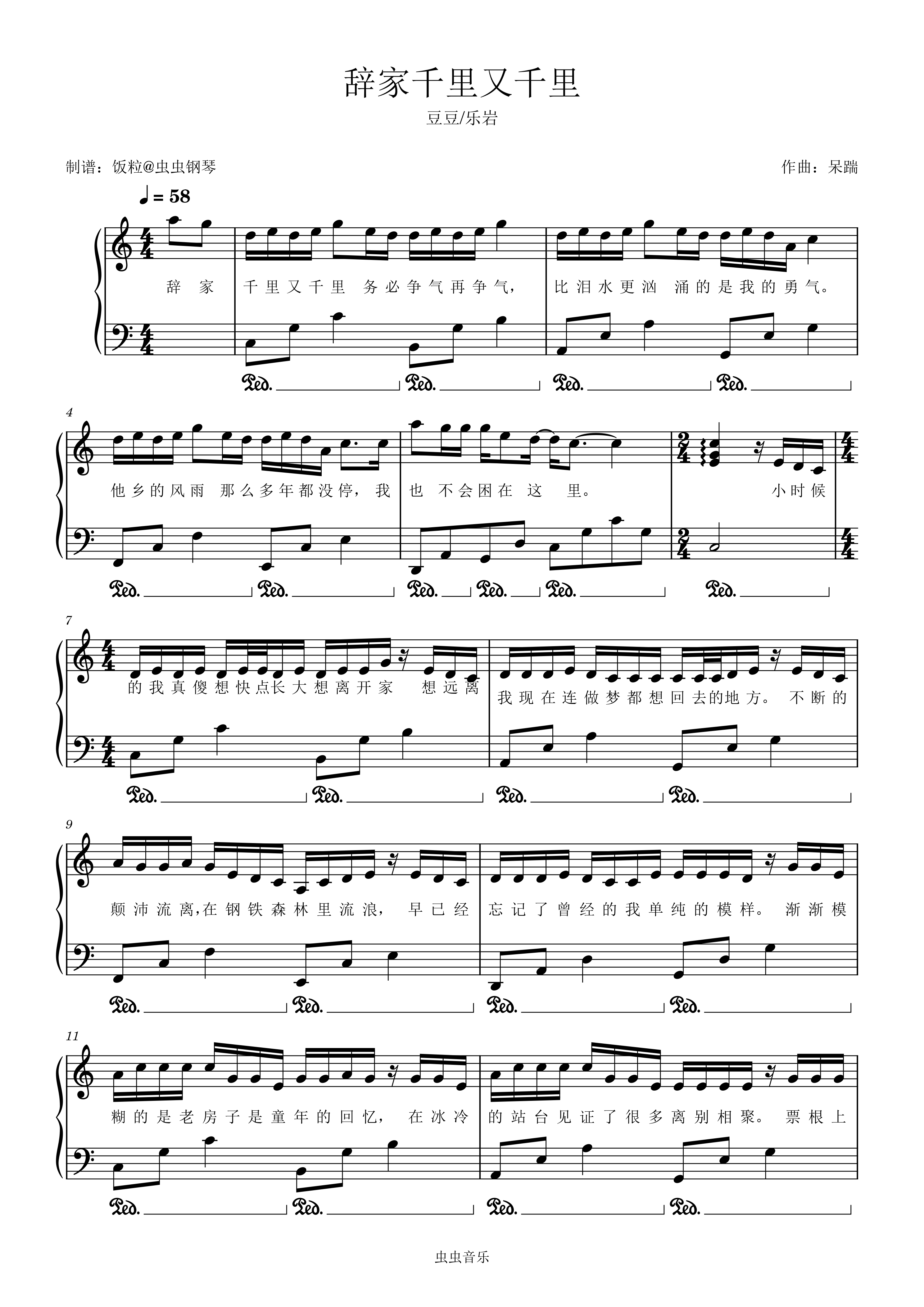辞家千里又千里钢琴简谱 数字双手 呆踹