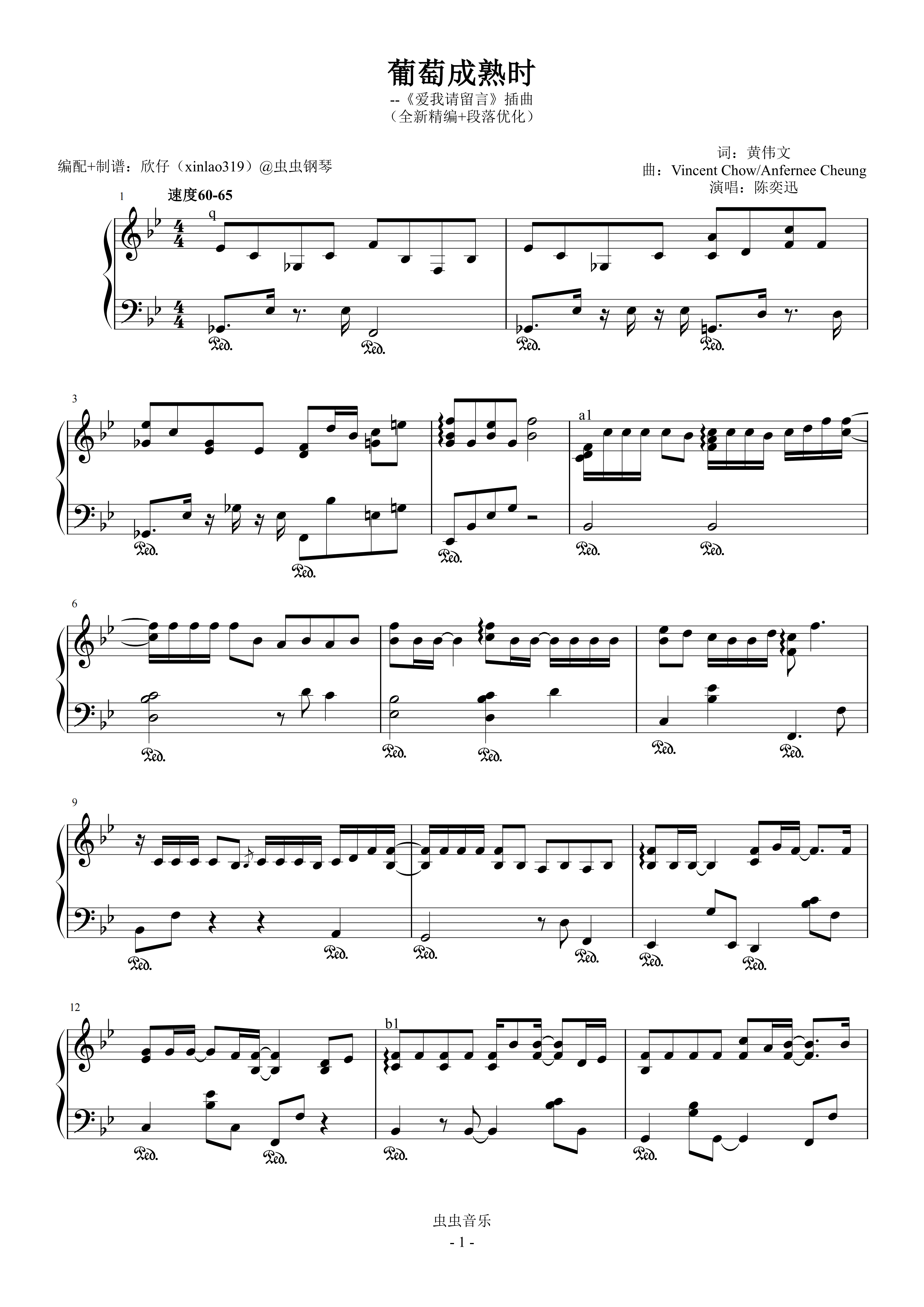 钢琴谱:葡萄成熟时(原调降B、陈奕迅《爱我请留言》插曲、段落优化)