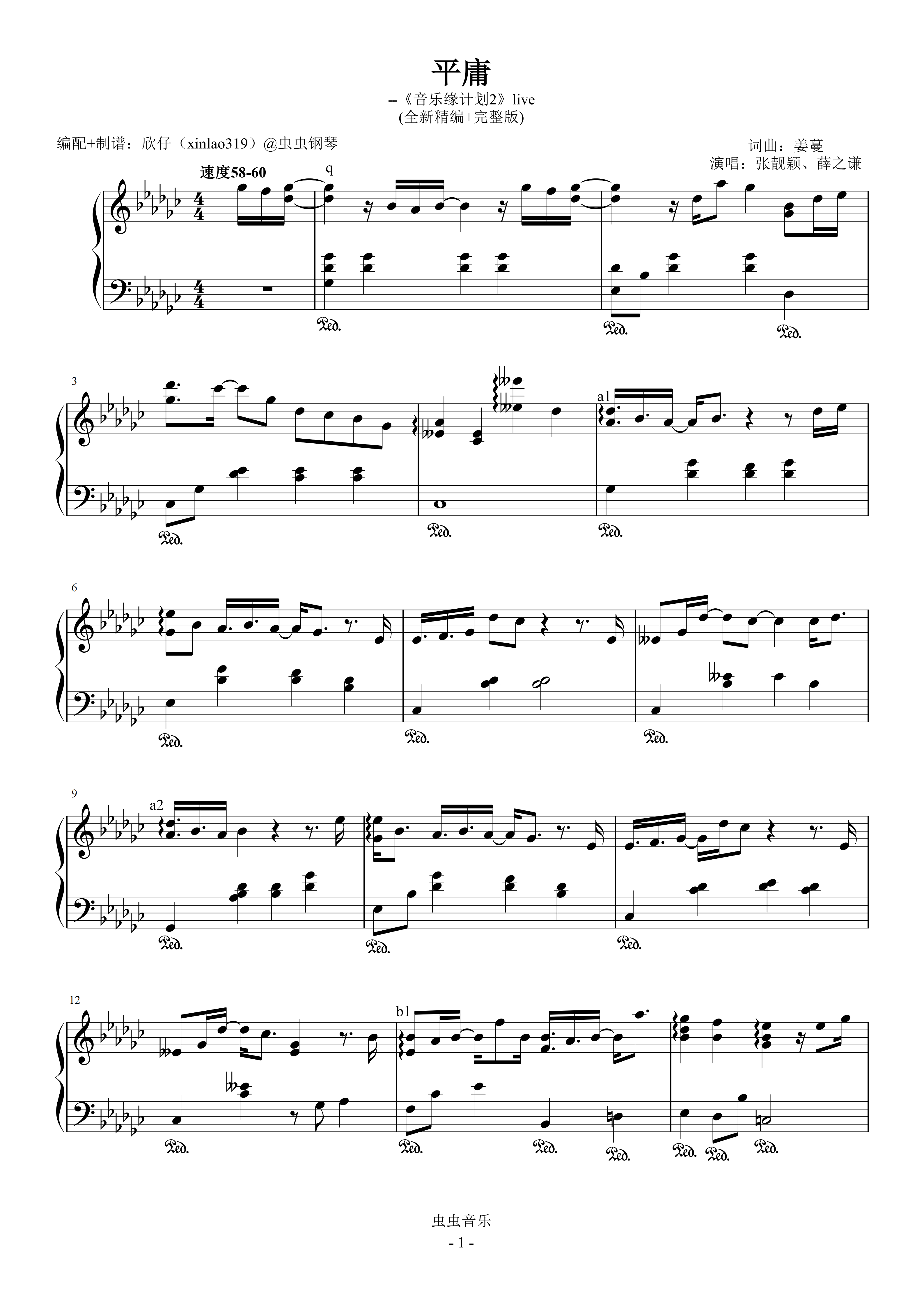 钢琴谱:平庸(原调降G、张靓颖、薛之谦《音乐缘计划2》live、完整版)