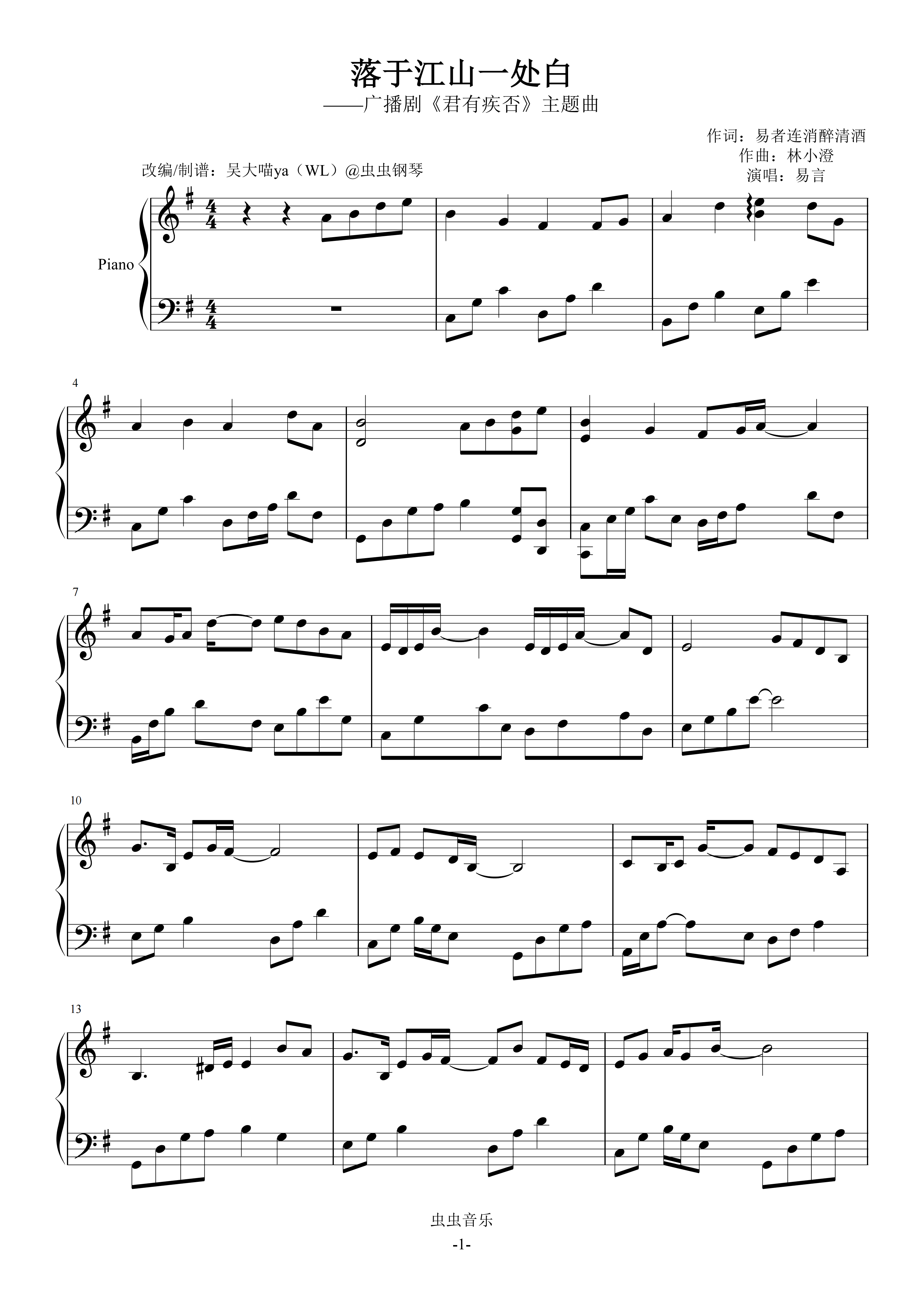 钢琴谱:落于江山一处白-广播剧《君有疾否》主题曲 原调