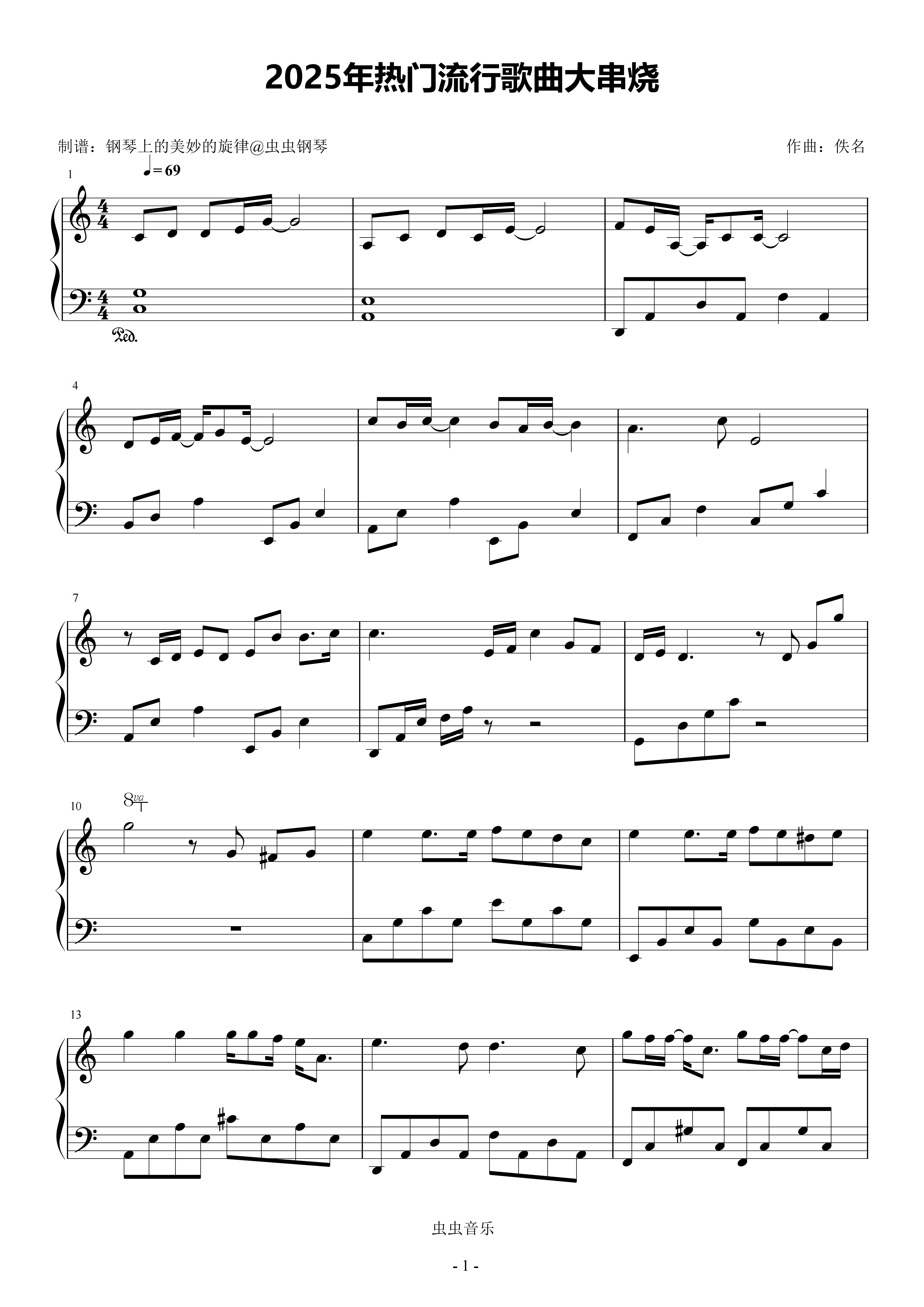 钢琴谱:2025热门流行歌曲大串烧 C调简易版