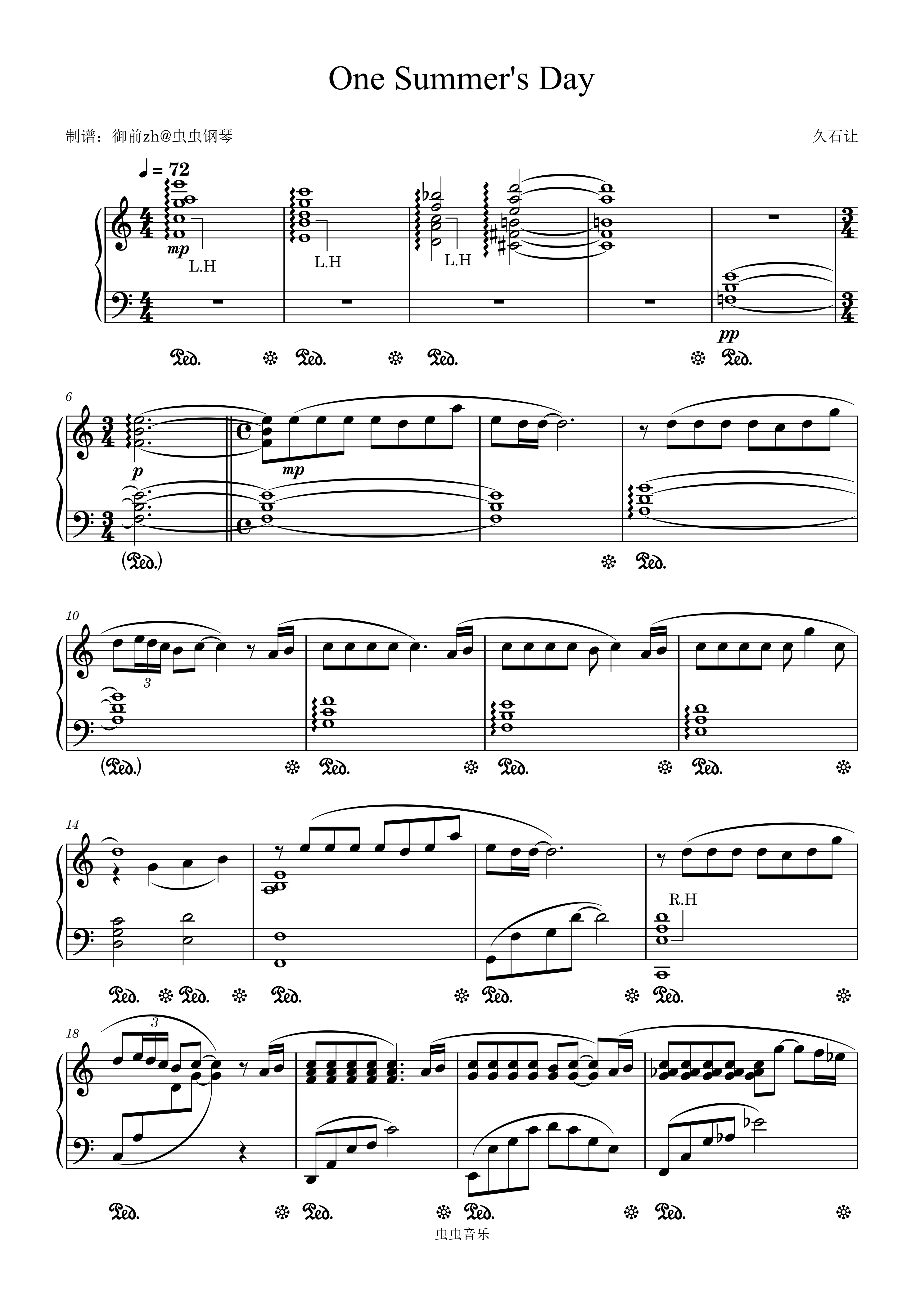 钢琴谱:那个夏天 One Summer's Day (动画《千与千寻》插曲) 久石让
