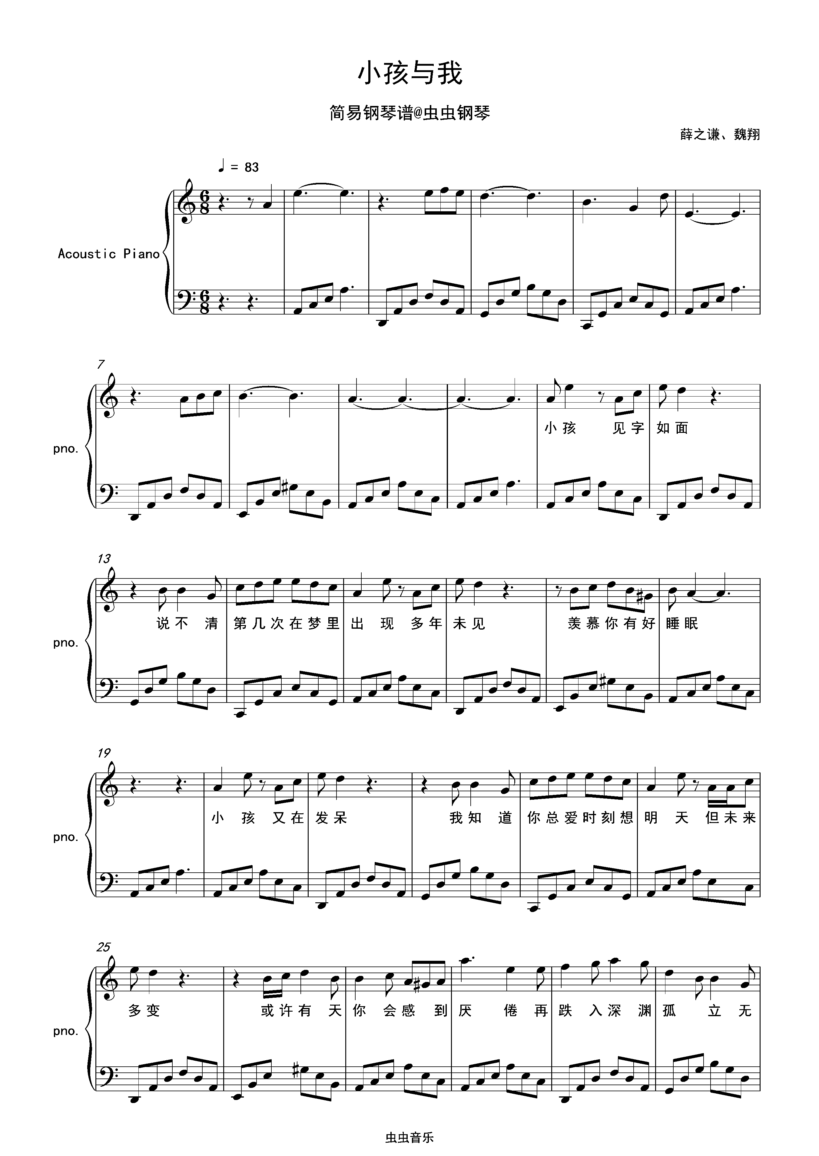 钢琴谱:小孩与我-薛之谦、魏翔 C调独奏