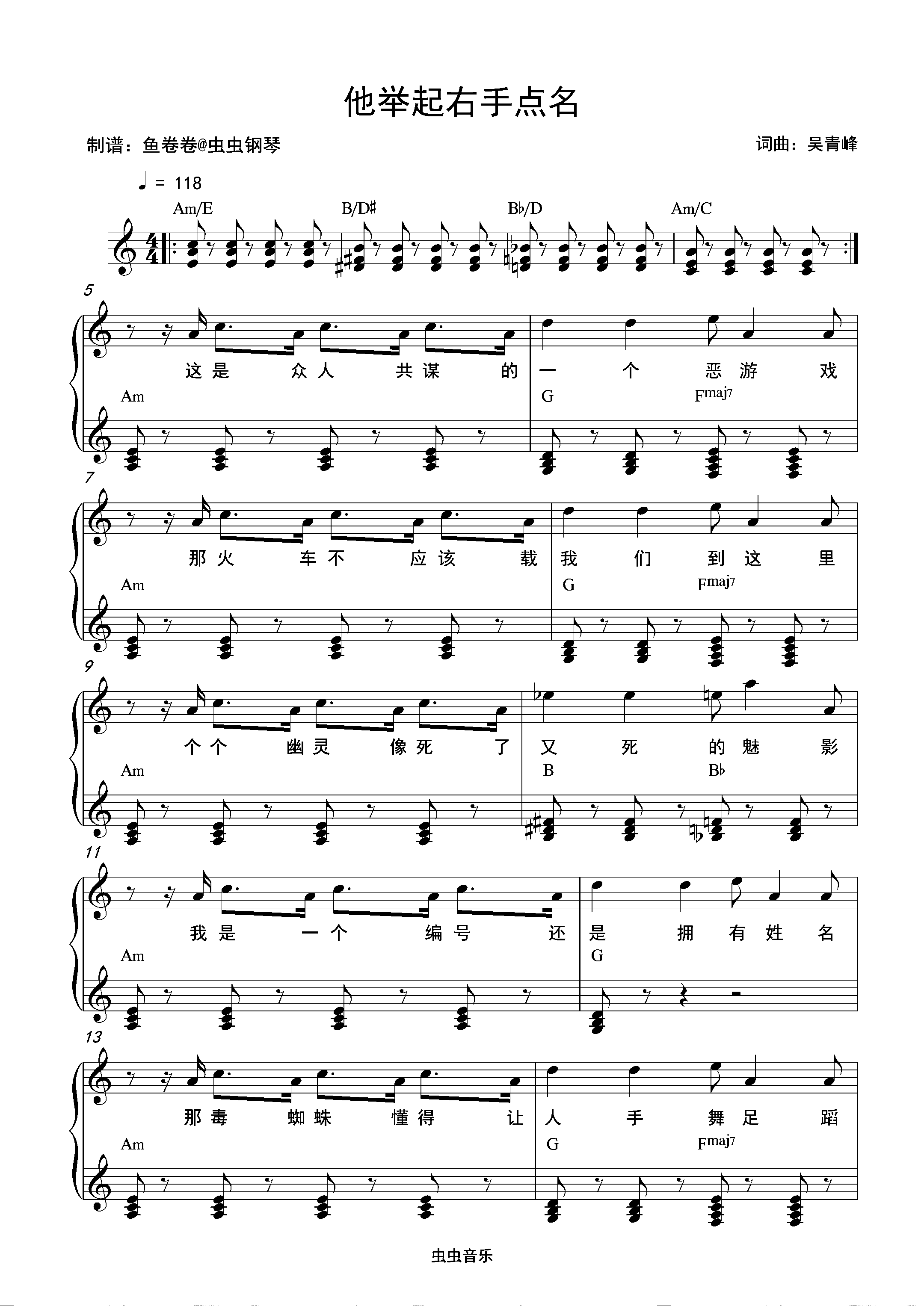 钢琴谱:他举起右手点名-苏打绿 C调钢琴谱