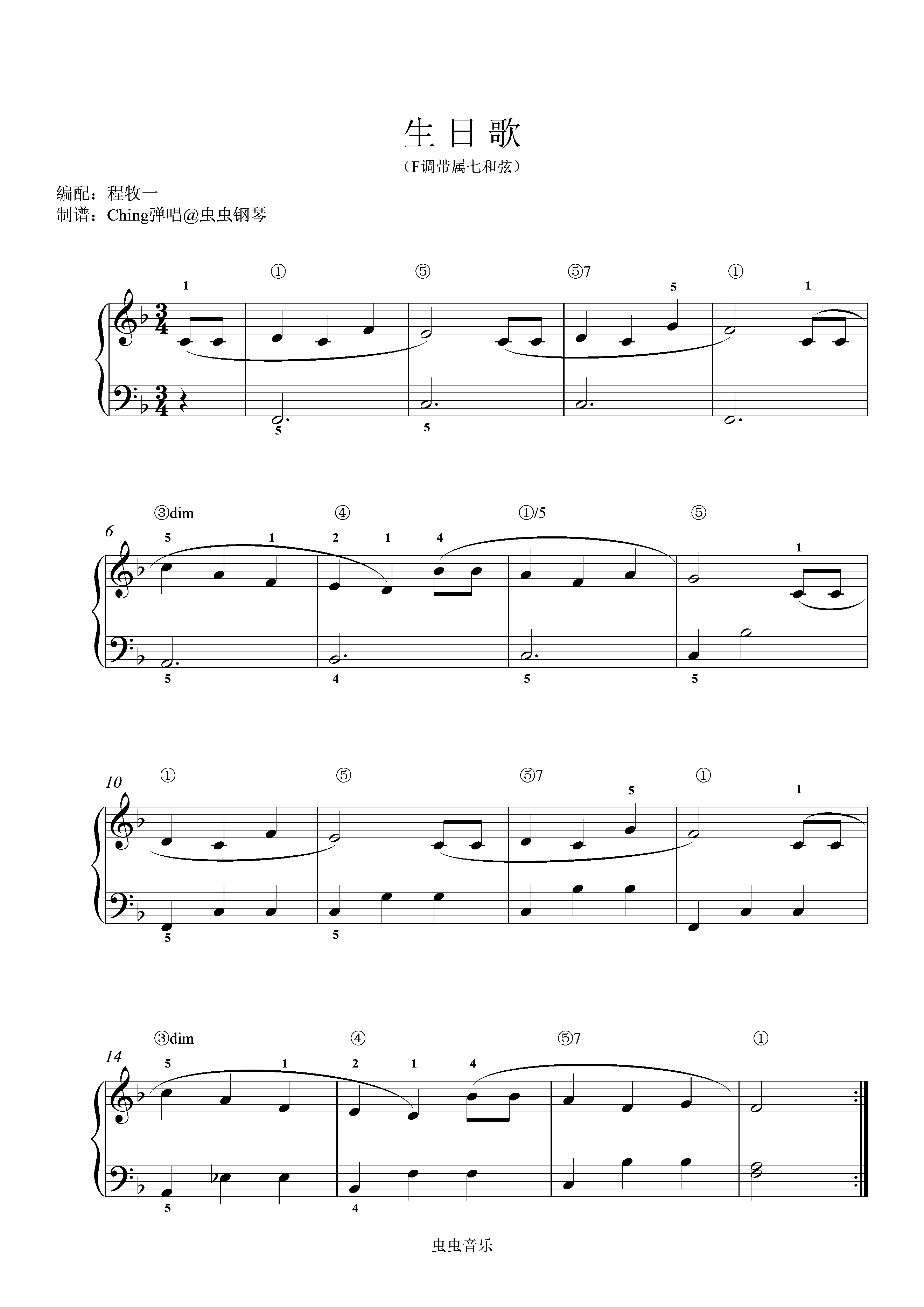 • 生日歌钢琴简谱 F调 数字双手