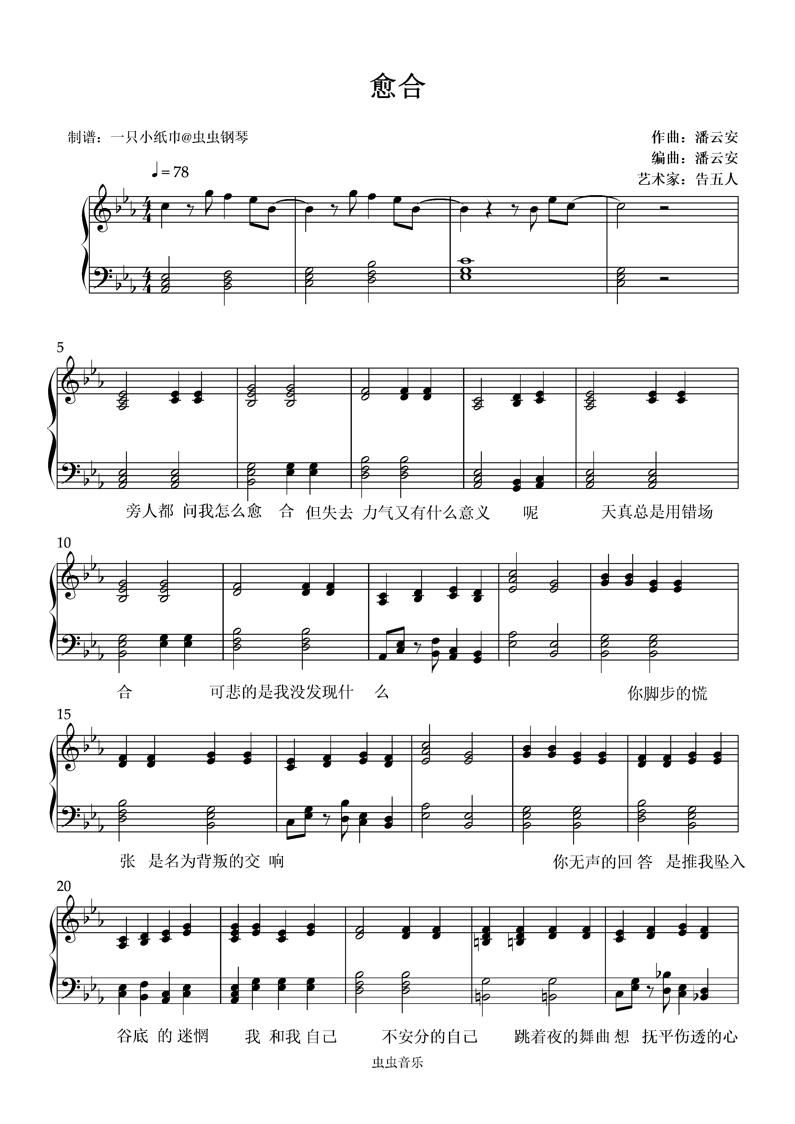 钢琴谱:愈合--告五人 弹唱版