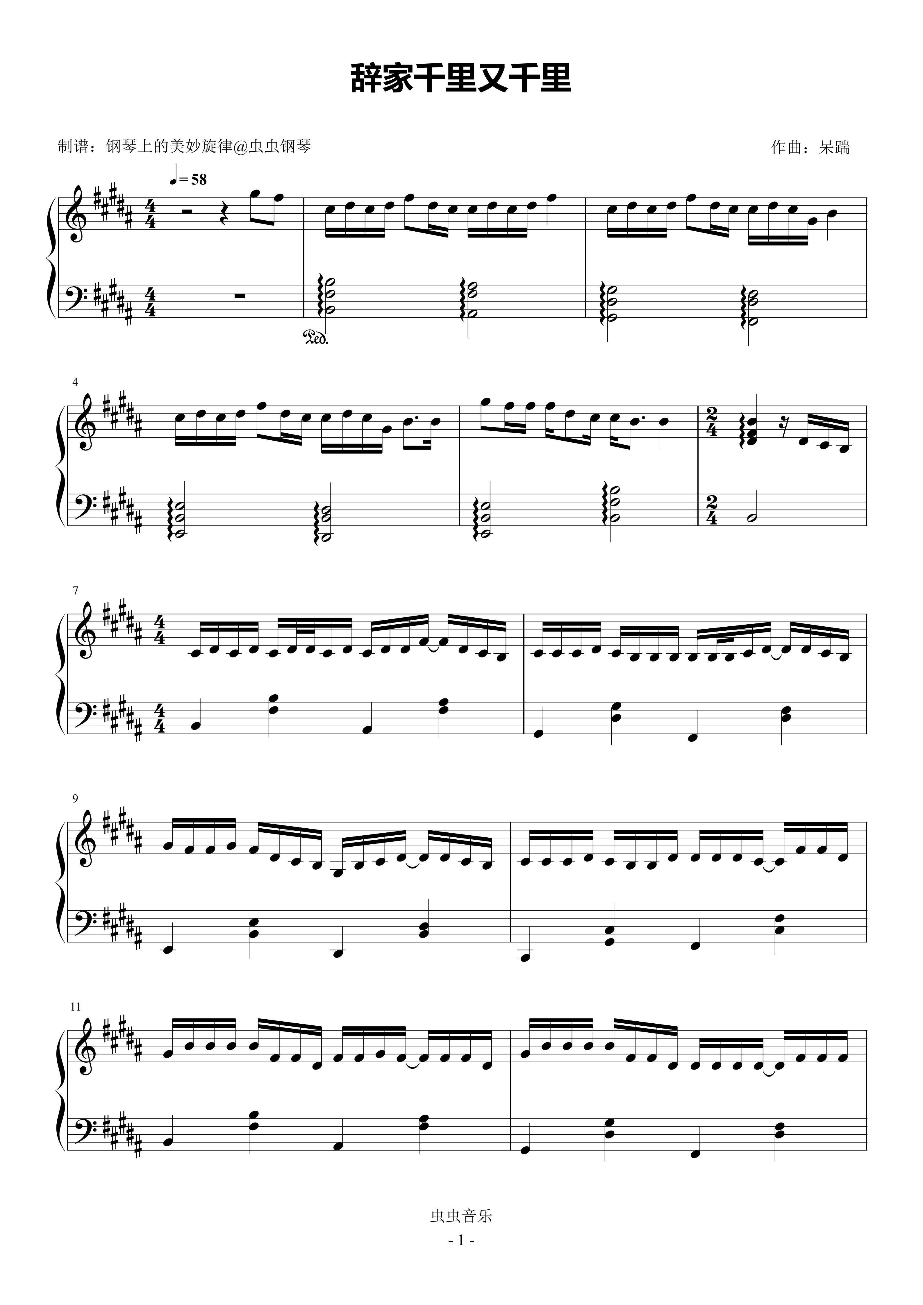 钢琴谱:辞家千里又千里 简易版 豆豆,乐岩