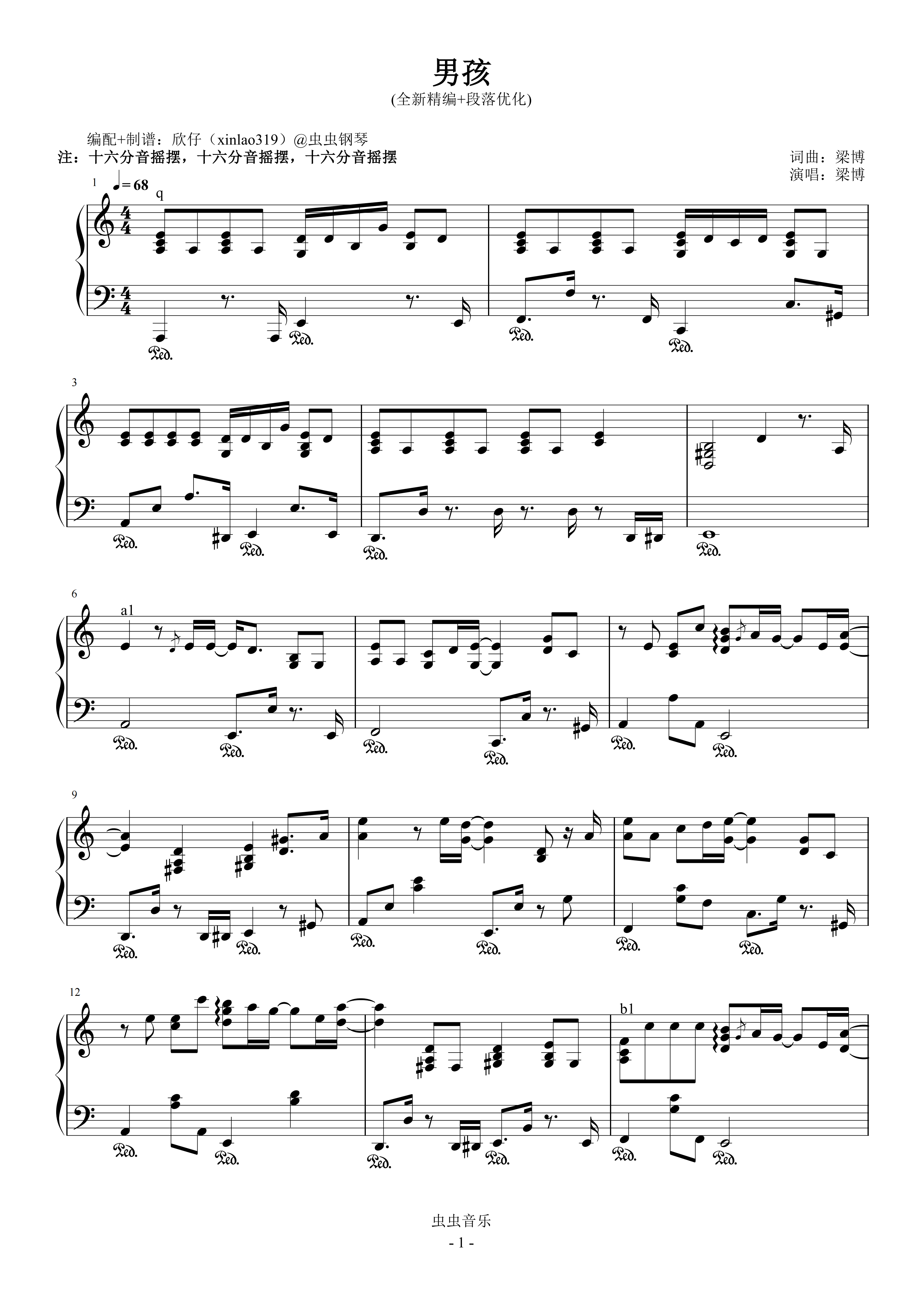 • 男孩钢琴简谱 C#调 数字双手 梁博