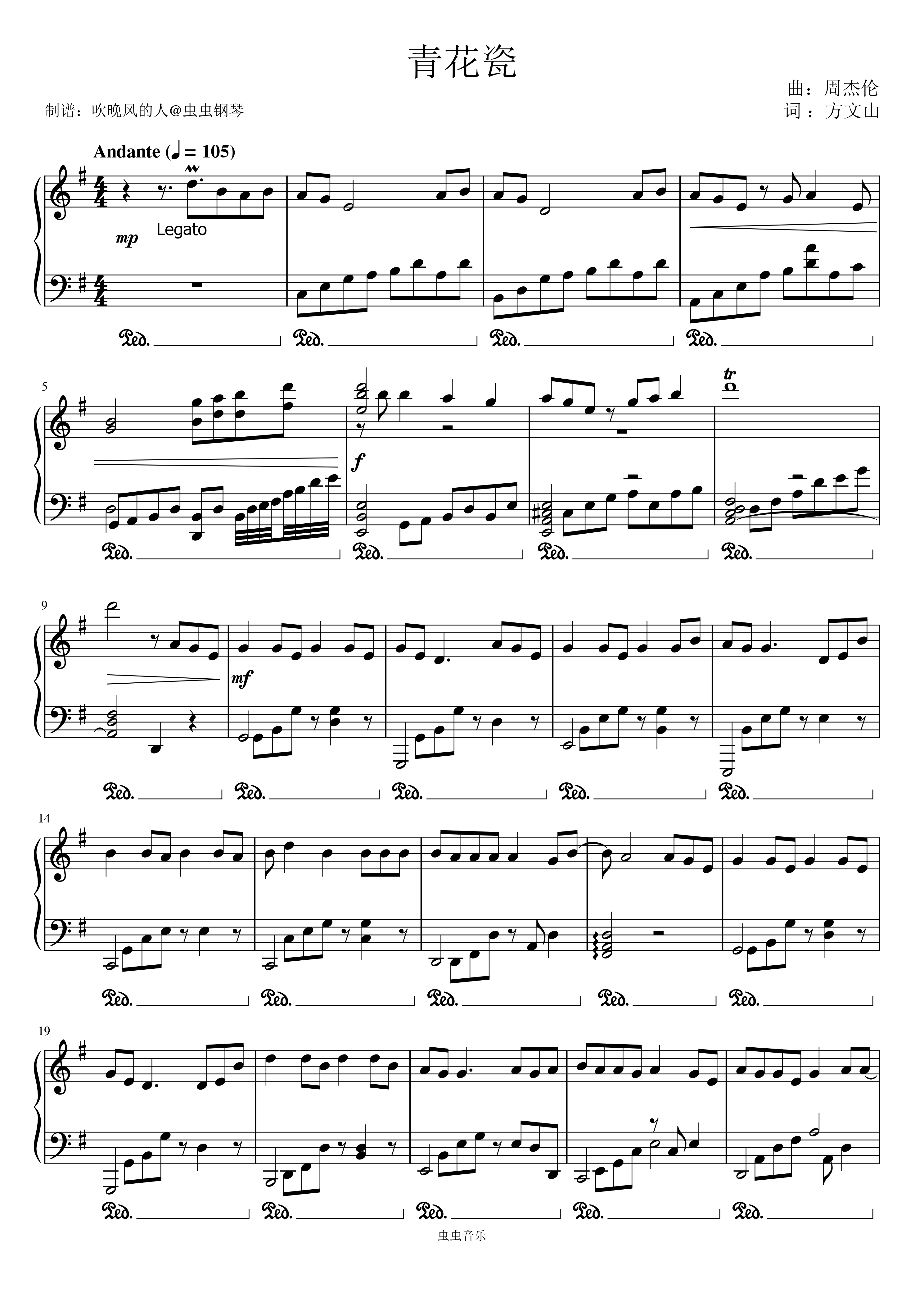 钢琴谱:周杰伦《青花瓷》G大调独奏版