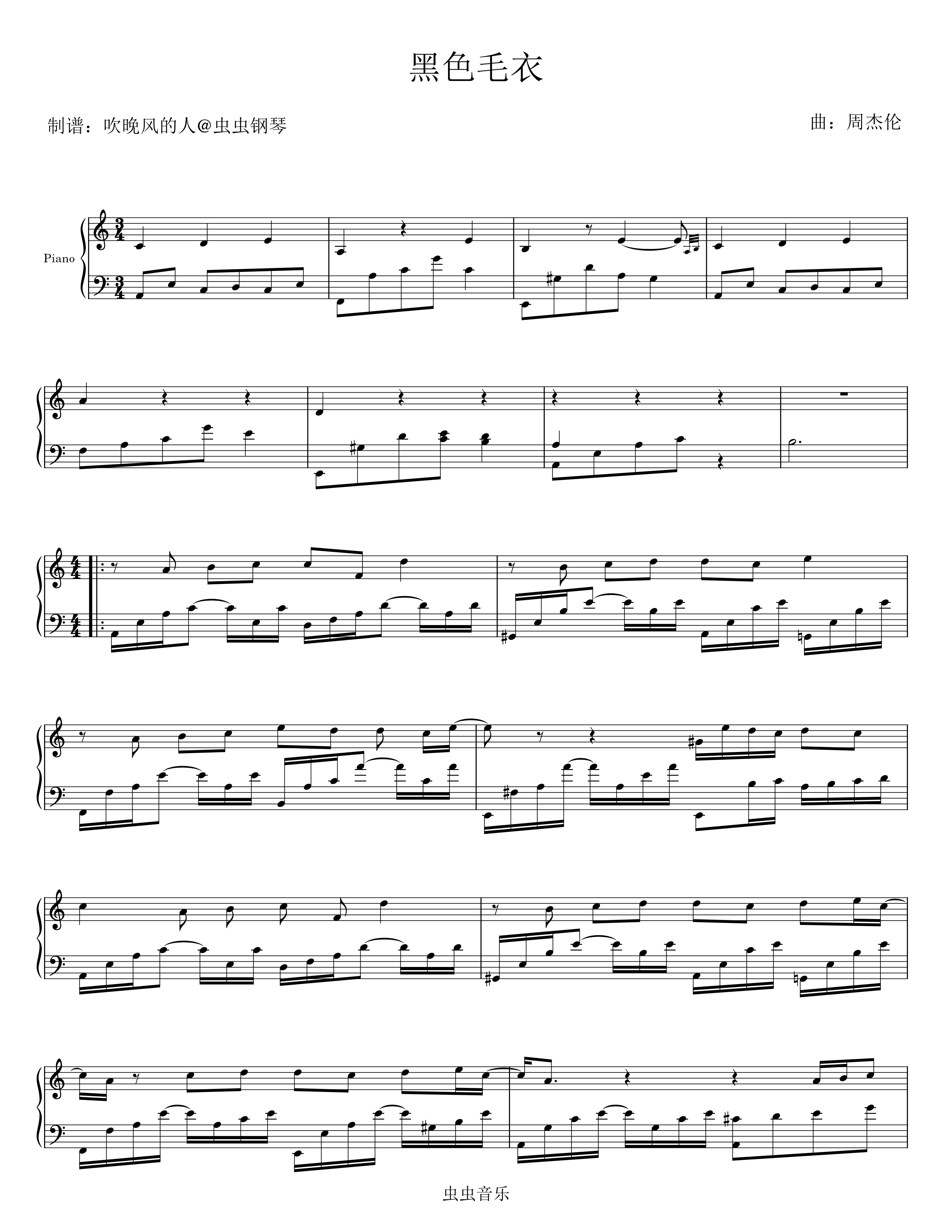 • 黑色毛衣钢琴简谱 C调 数字双手 周杰伦
